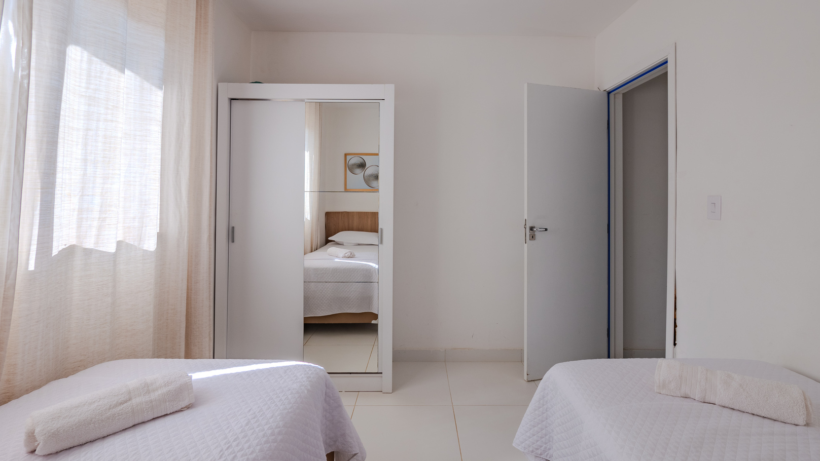 - Quarto 2: cama de solteiro e cama de solteiro, ar-condicionado, armário e edredom