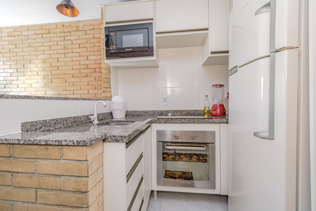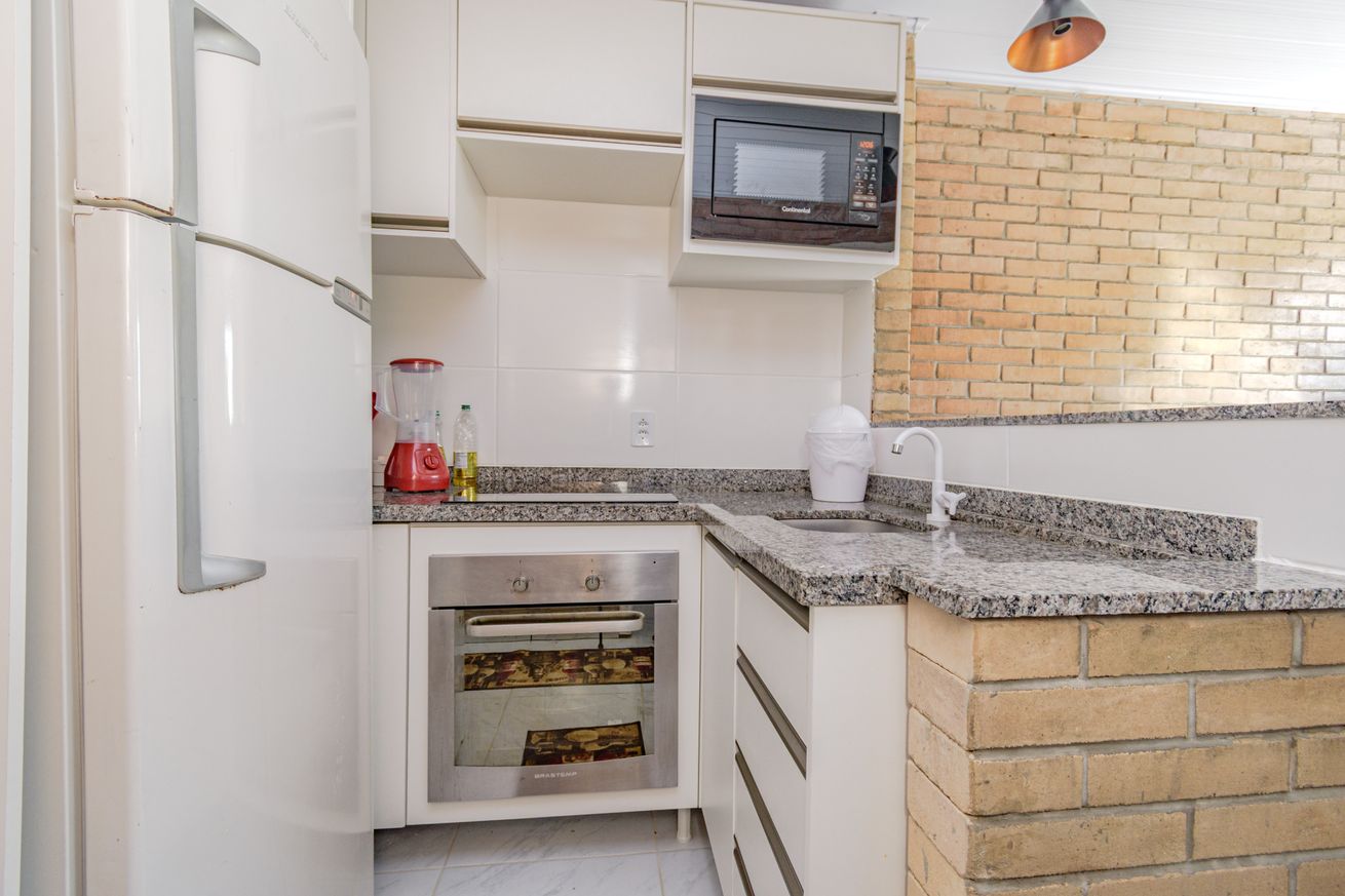 - Cozinha com cooktop, forno, geladeira, micro ondas, liquidificador, torradeira, utensílios completos(exceto óleo e sal), balcão e mesa