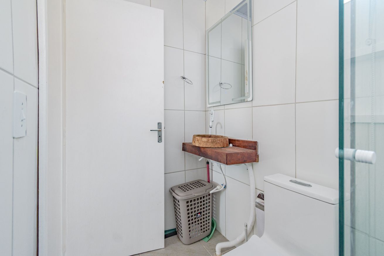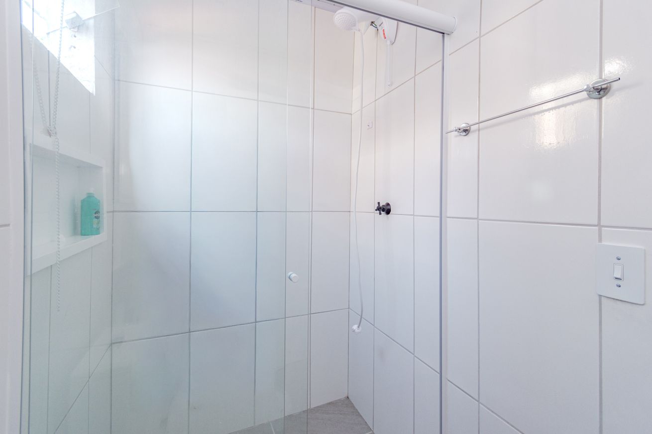 - Banheiro com chuveiro elétrico e box de vidro