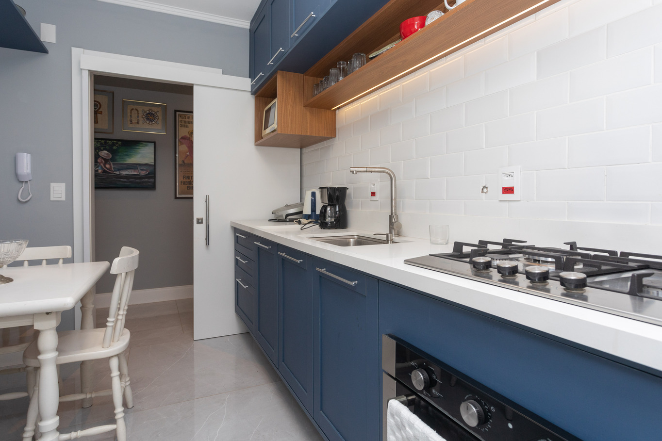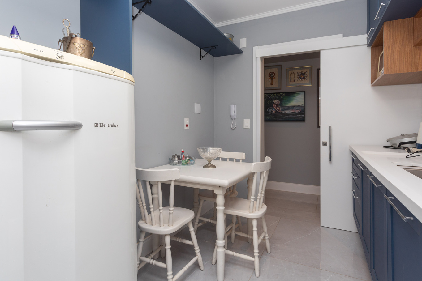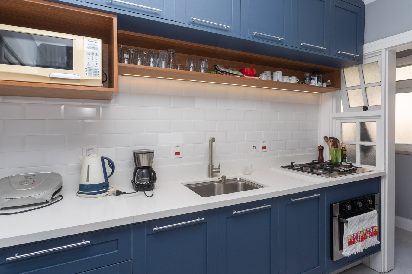 - Cozinha equipada com cooktop, geladeira, freezer, forno elétrico com função airfryer, micro-ondas, torradeira, utensílios completos, mesa para 3 pessoas e pia com água quente