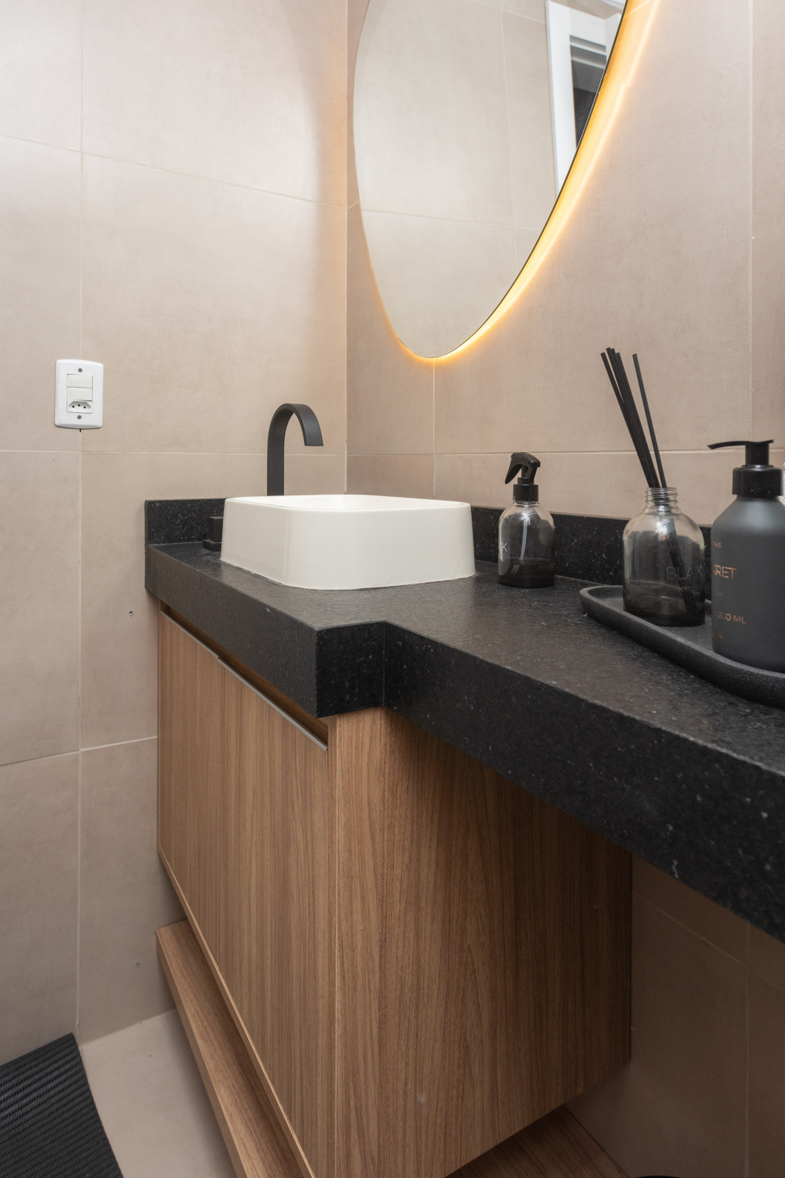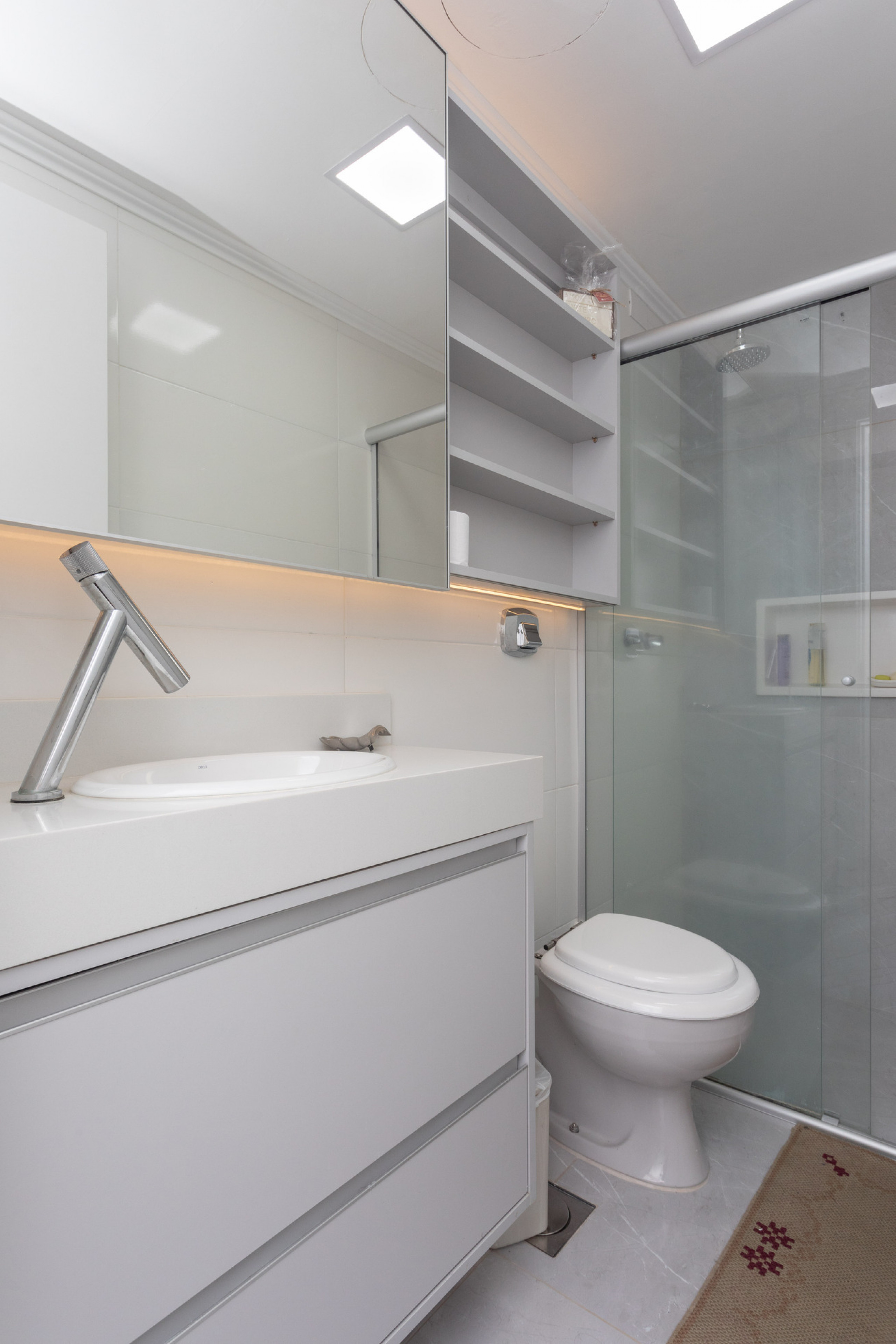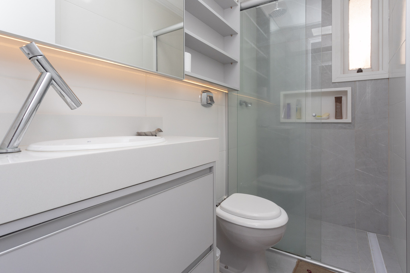 - Banheiro social com chuveiro a gás, box de vidro e pia com água quente.