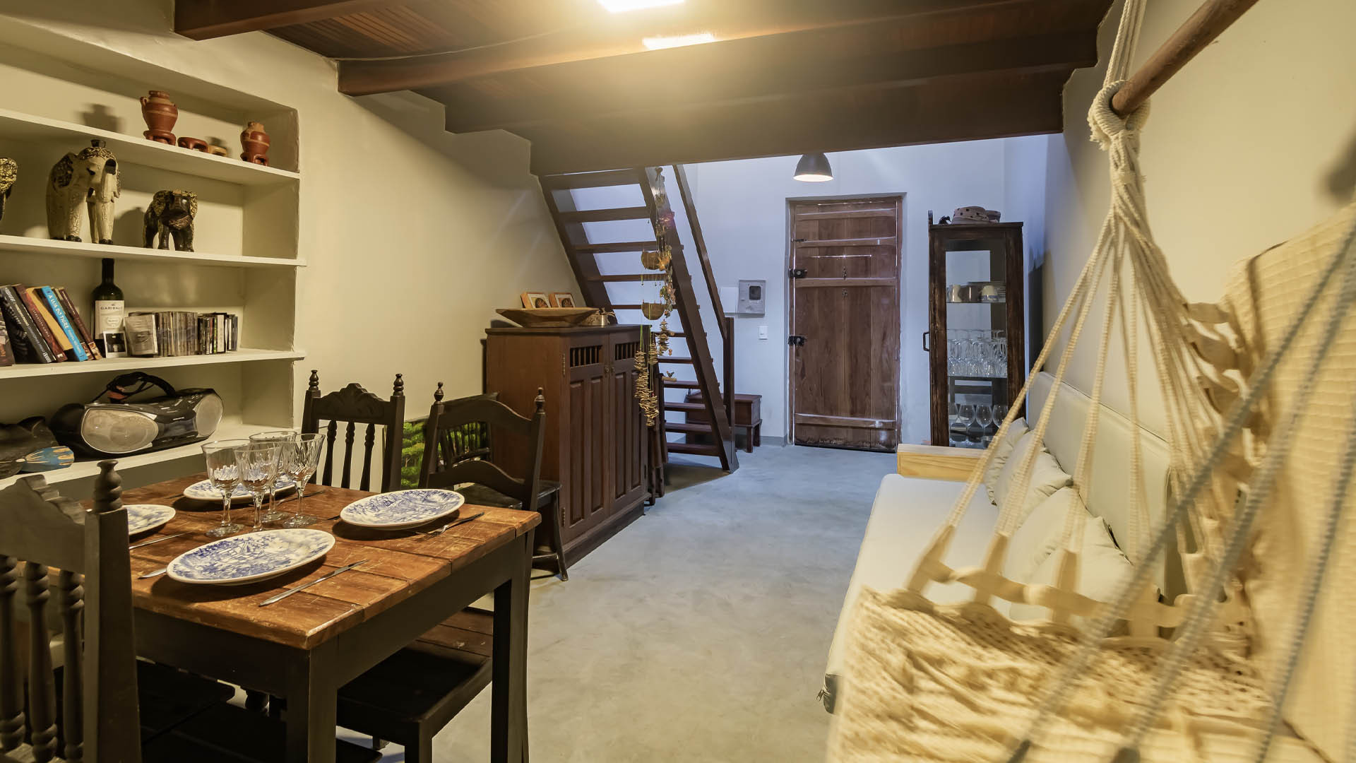 - Sala de estar com sofá-cama, mesa de jantar, cadeira, ar-condicionado e ambiente integrado ao loft