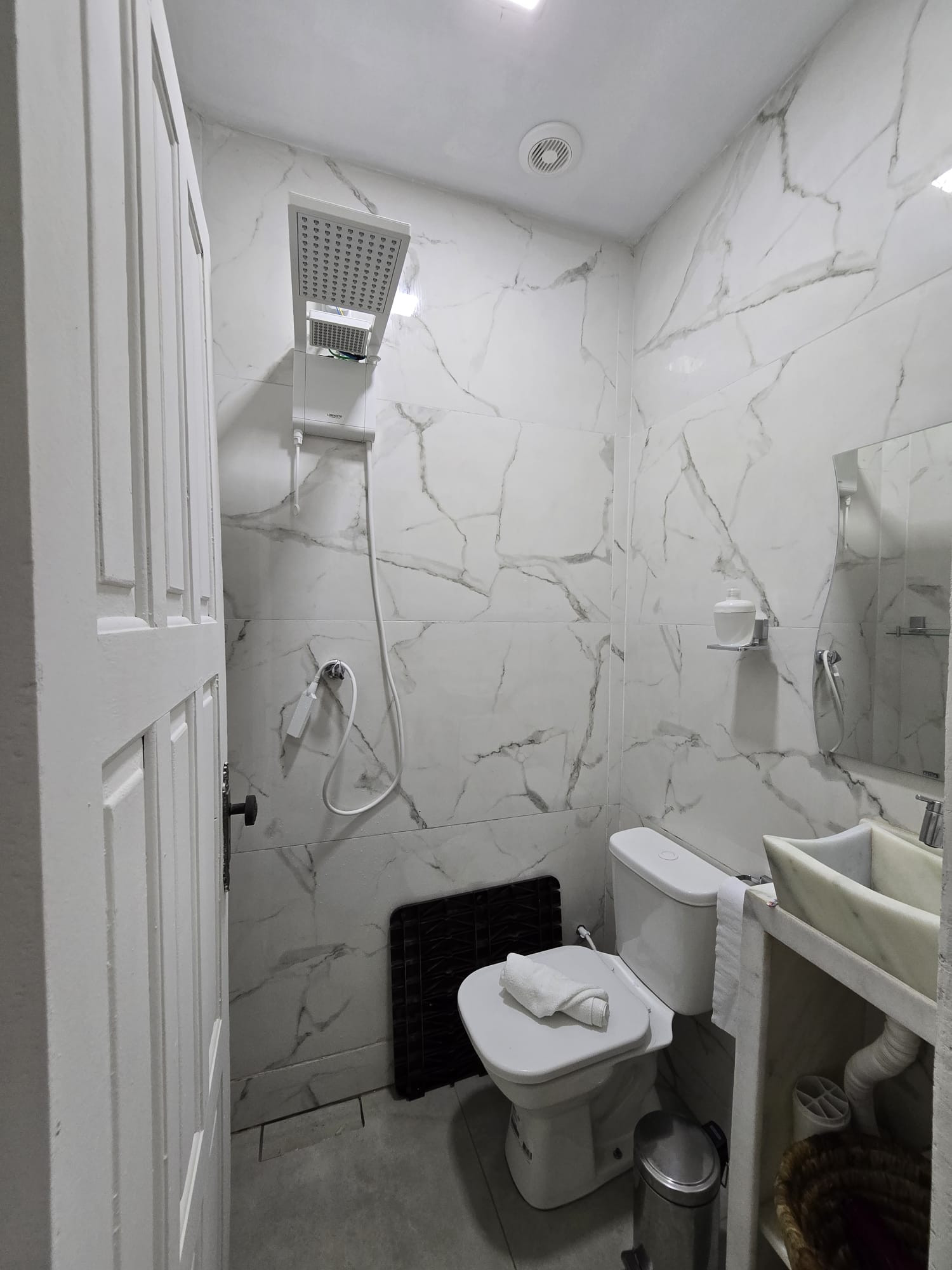 - Banheiro com chuveiro elétrico, secador de cabelo e kit básico de higiene