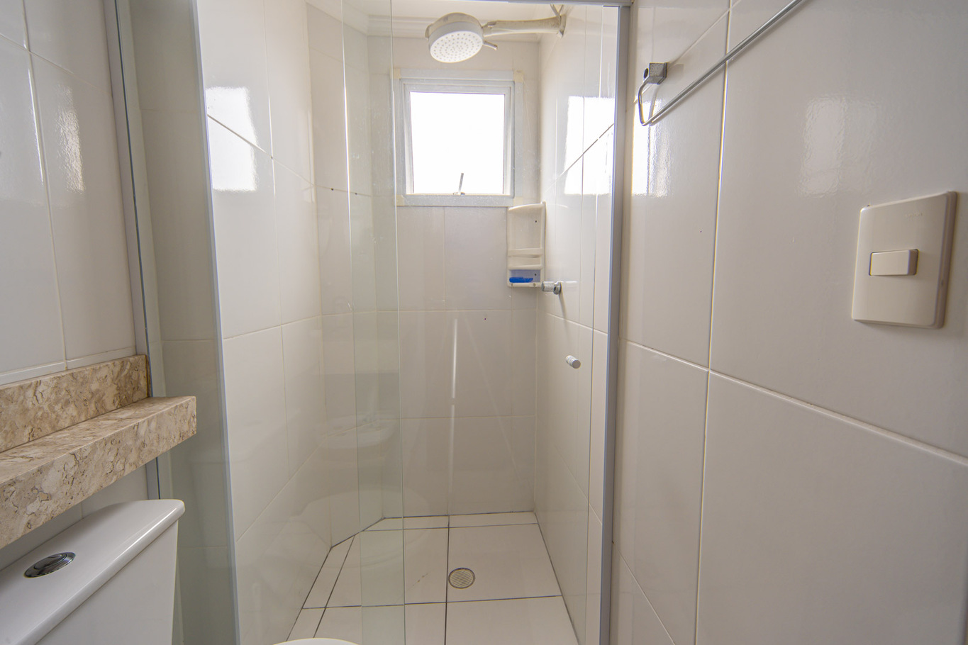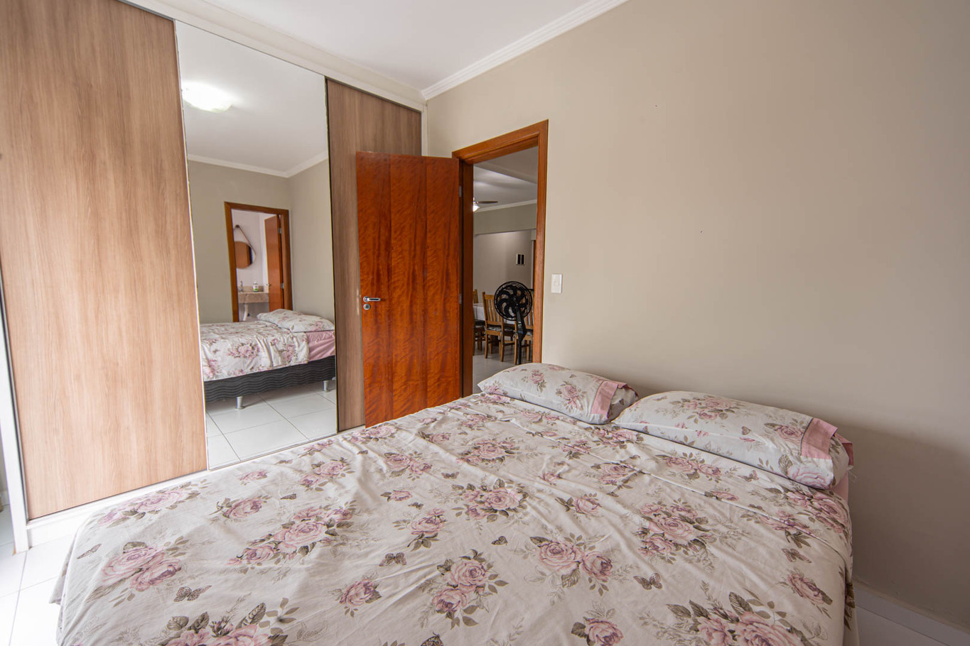 - Quarto 1 (suíte): cama de casal, armário, TV, ventilador e banheiro completo com chuveiro elétrico e box