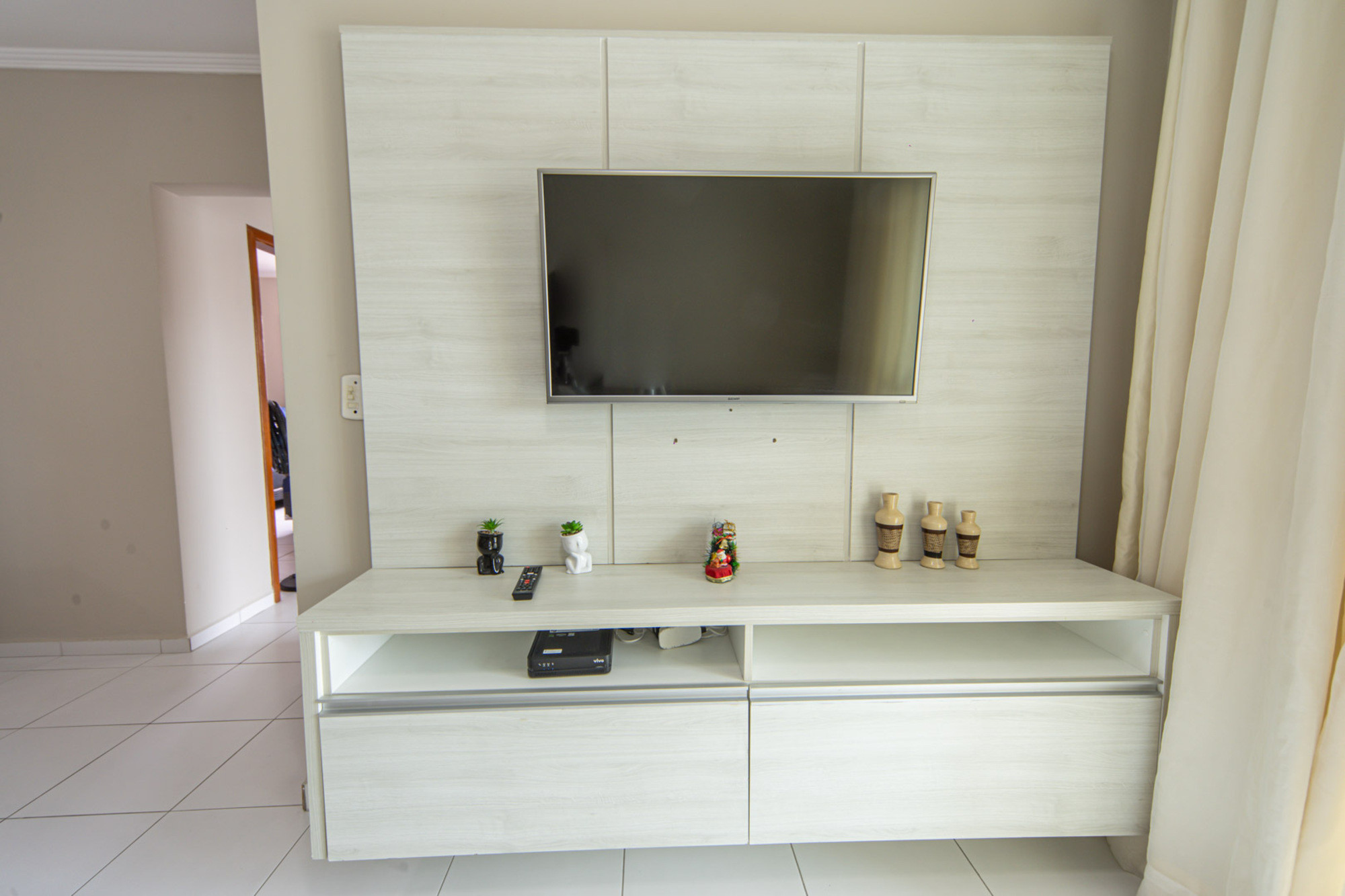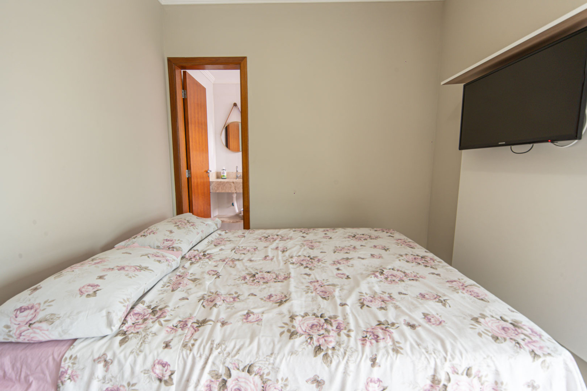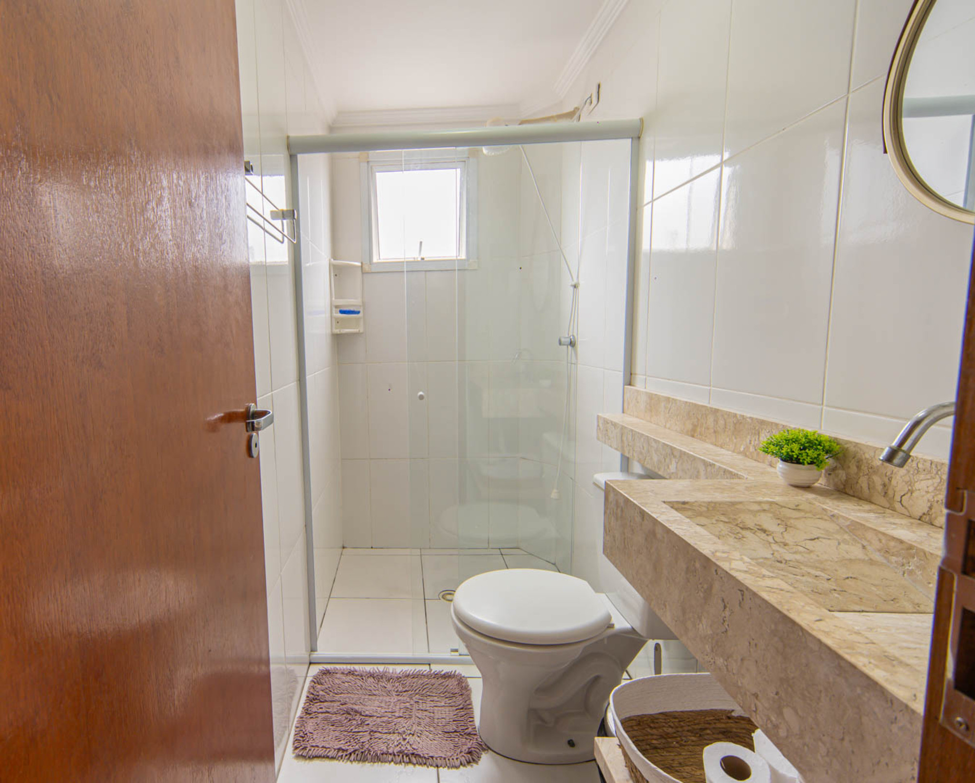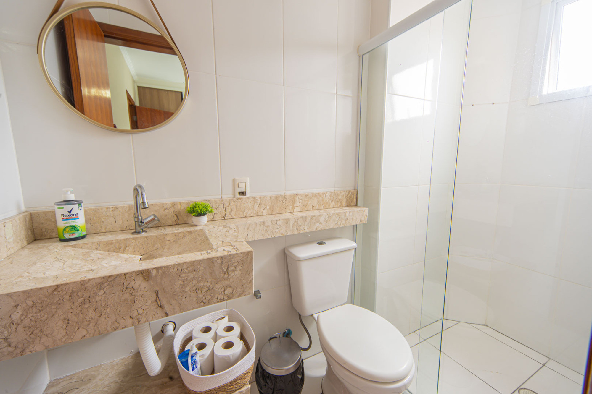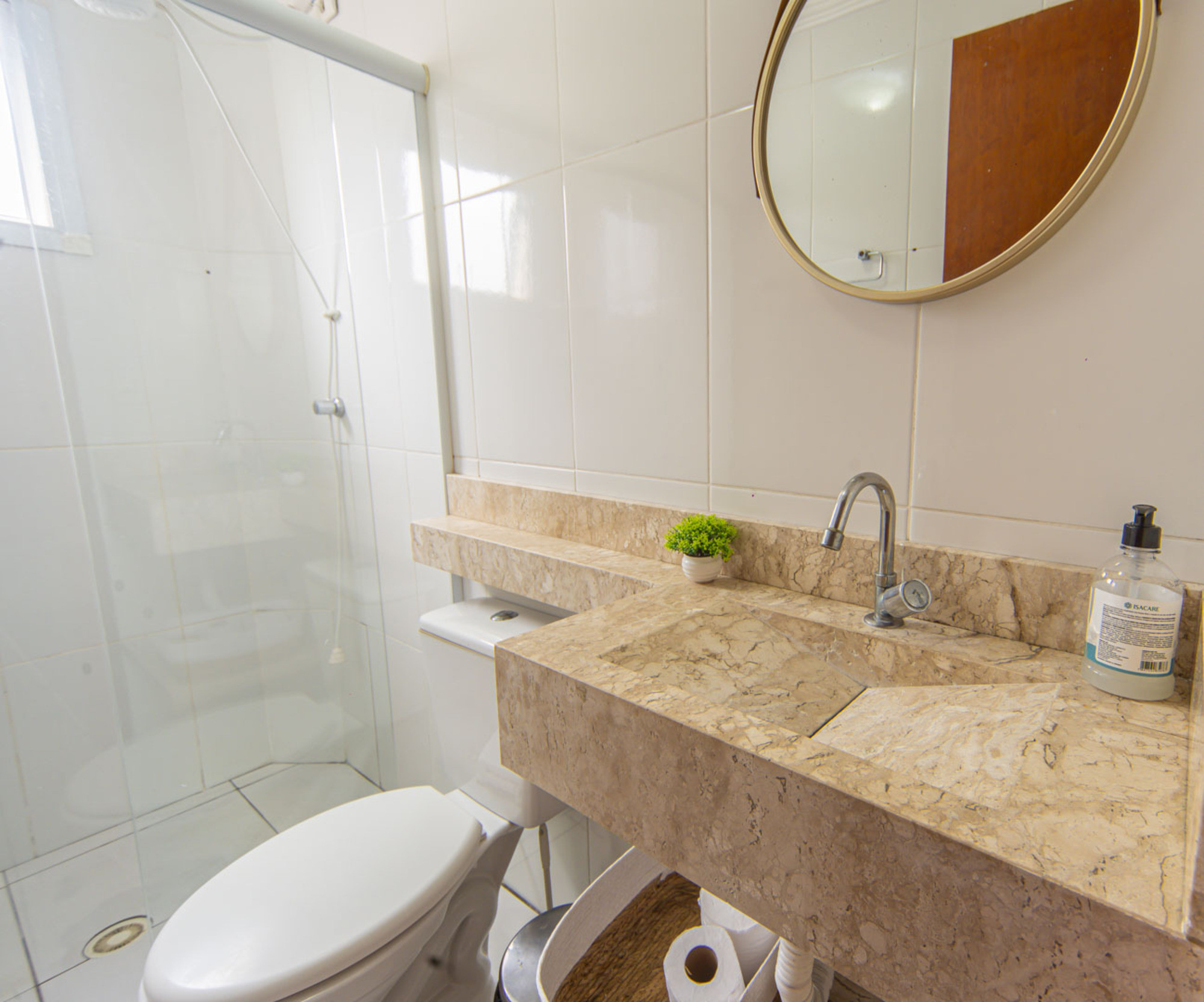 - Quarto 1 (suíte): cama de casal, armário, TV, ventilador e banheiro completo com chuveiro elétrico e box