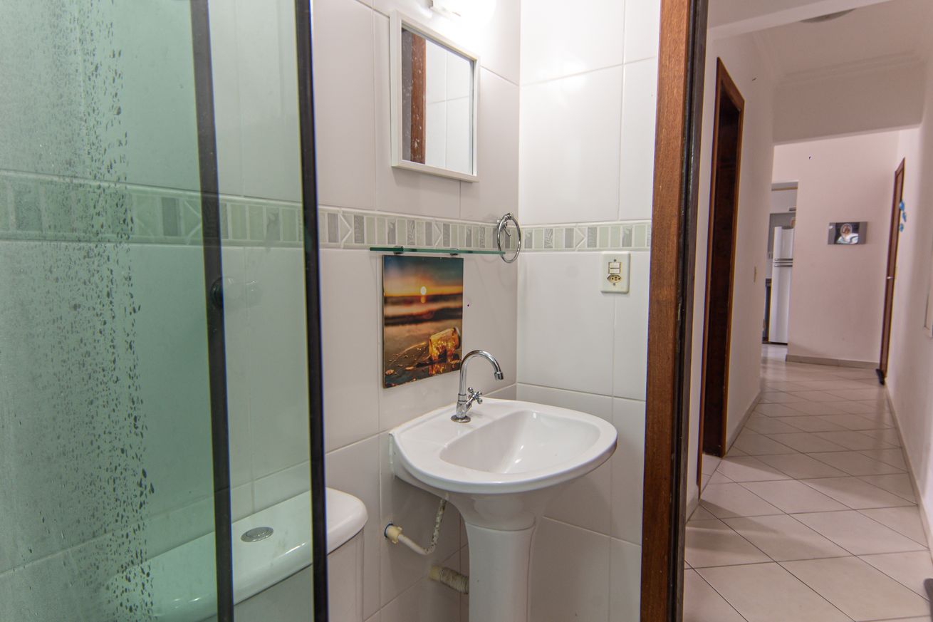 - Banheiro com chuveiro elétrico e box de vidro