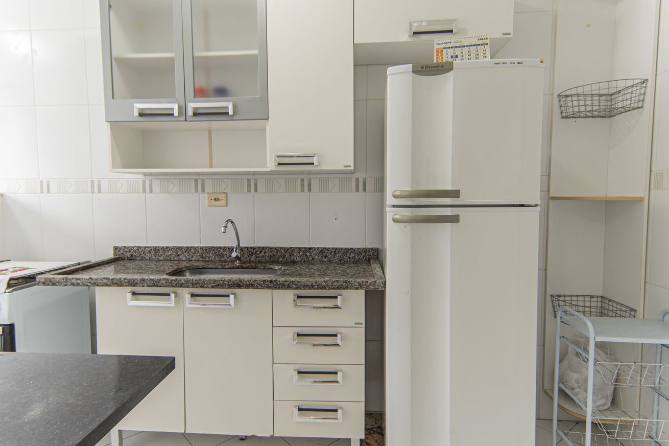- Cozinha com geladeira, freezer, fogão, forno, panelas, pratos, copos, talheres e utensílios de cozinha(exceto óleo e sal)