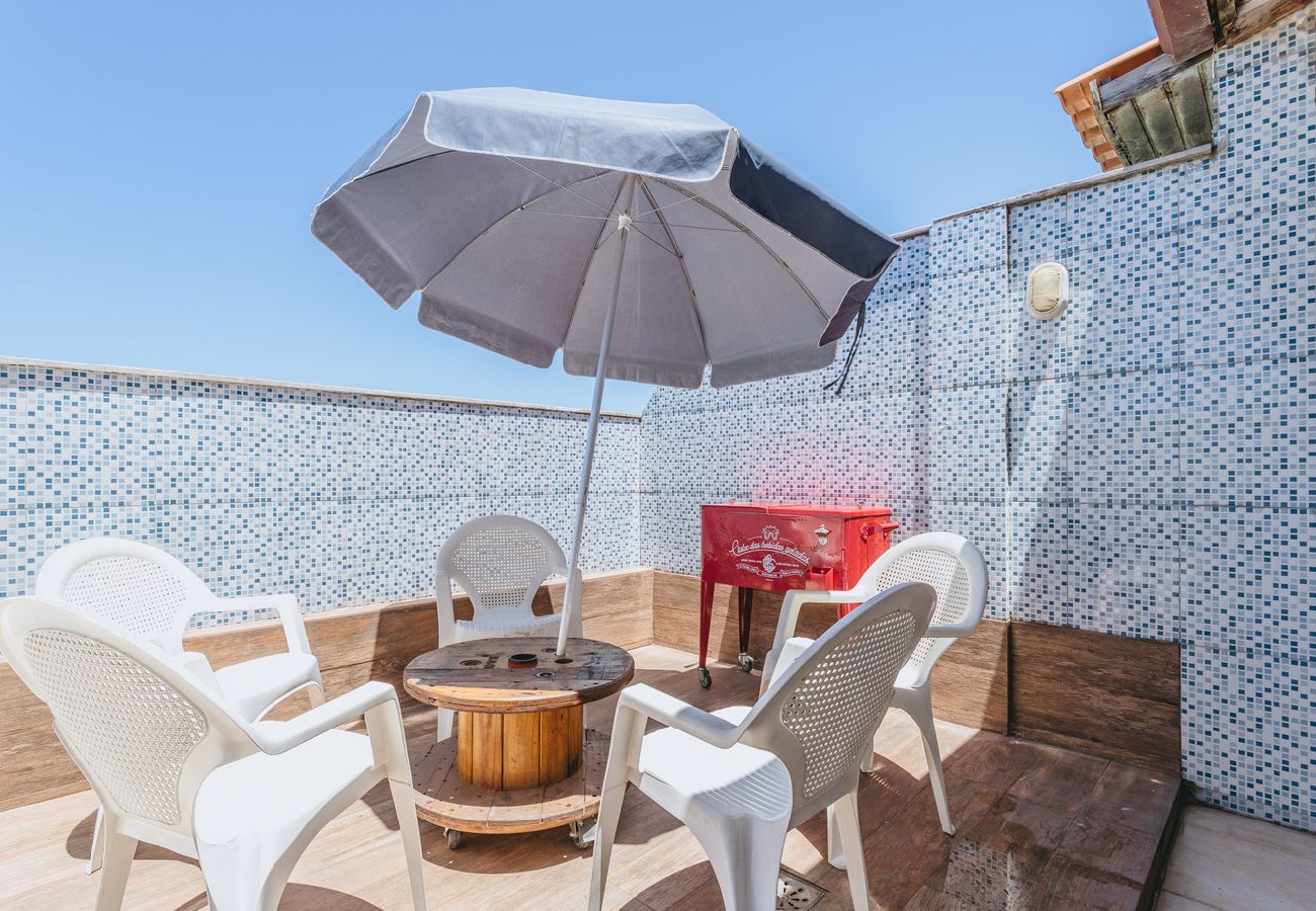 - Na cobertura há mesa com banco e cadeiras de plástico