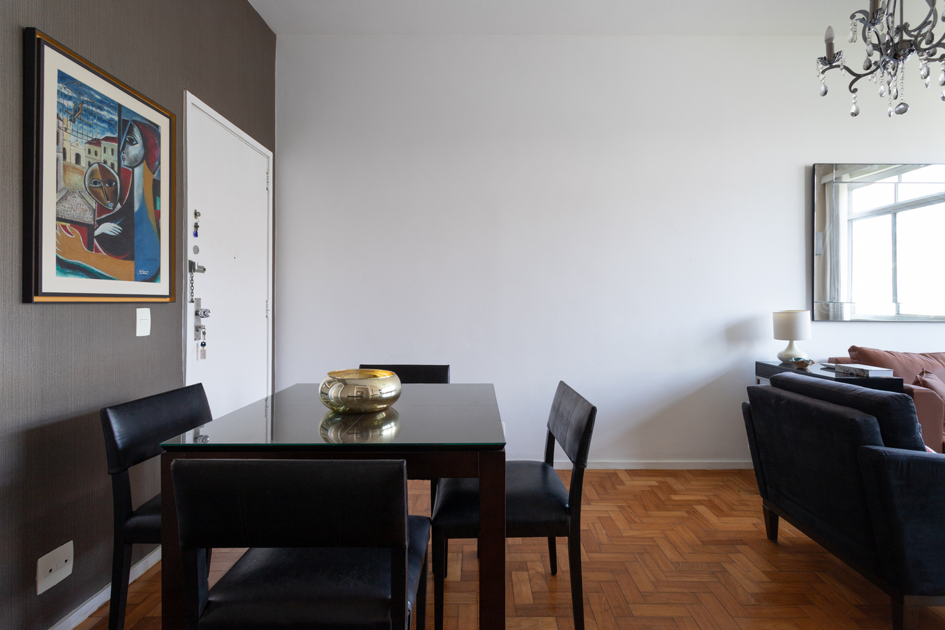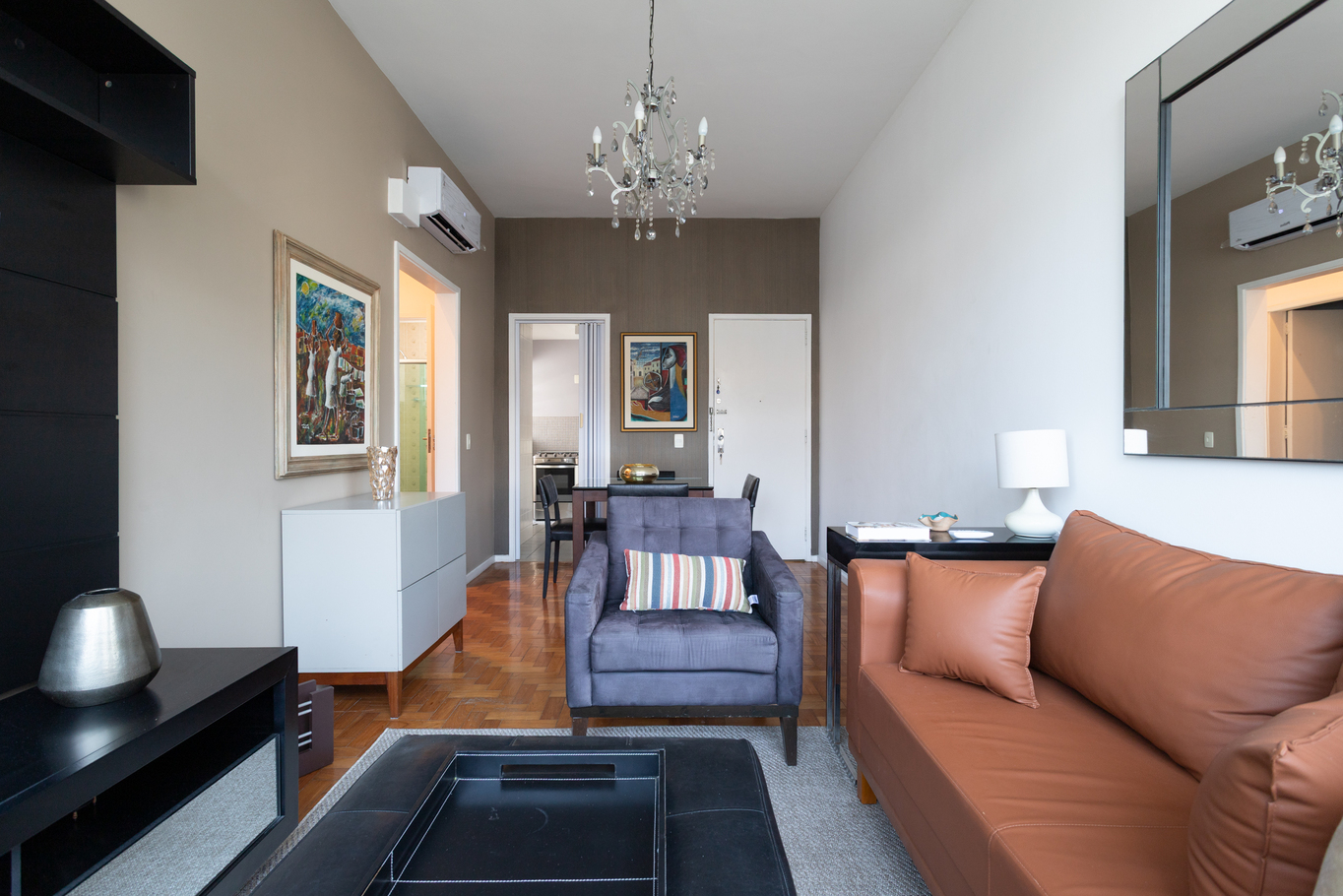 - Sala com sofá, poltrona, mesa de jantar, Smart TV e TV a cabo