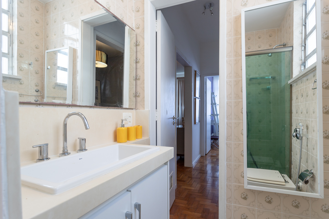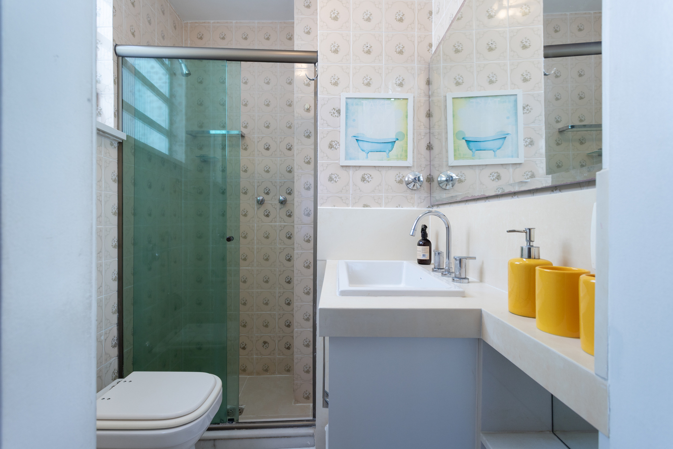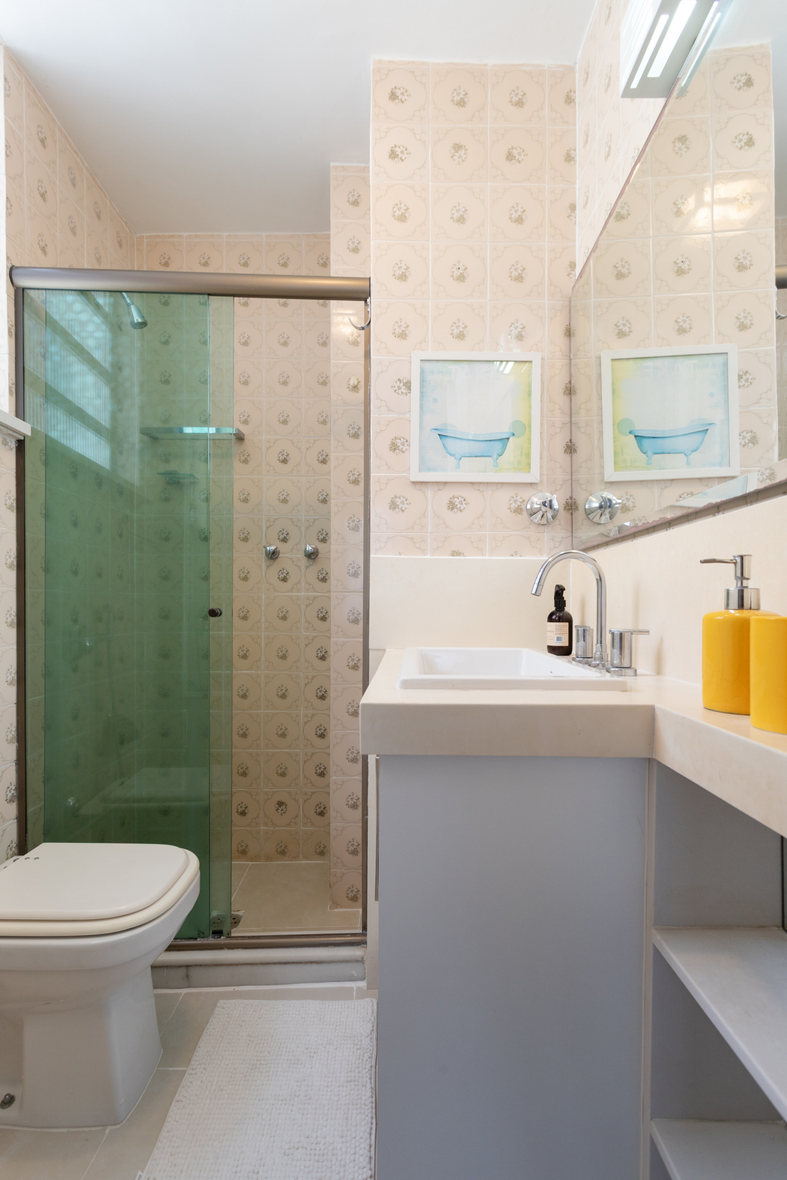 - Banheiro com chuveiro a gás, box de vidro e secador de cabelo
