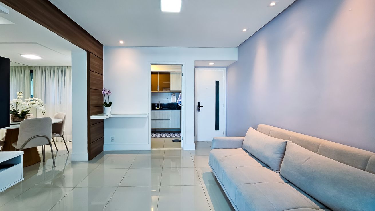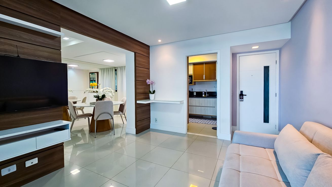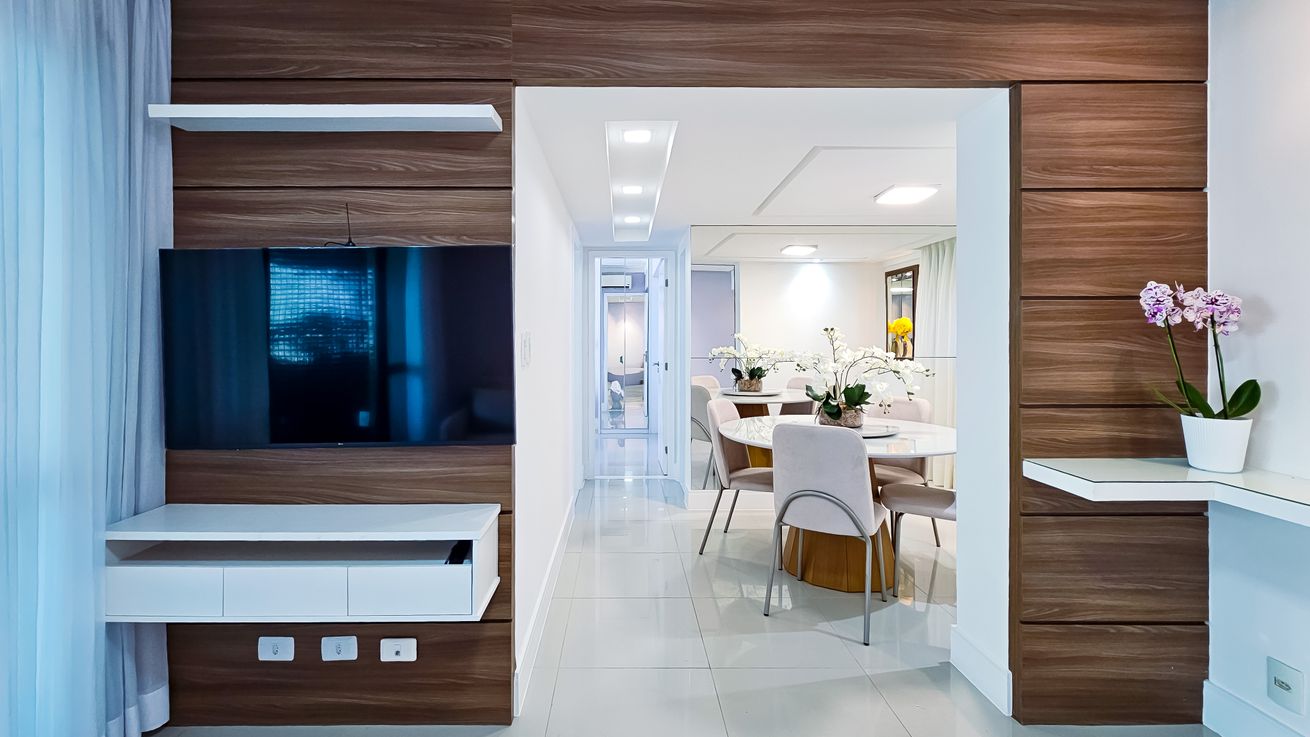 - Sala de estar com sofá-cama, Smart TV e mesa de jantar