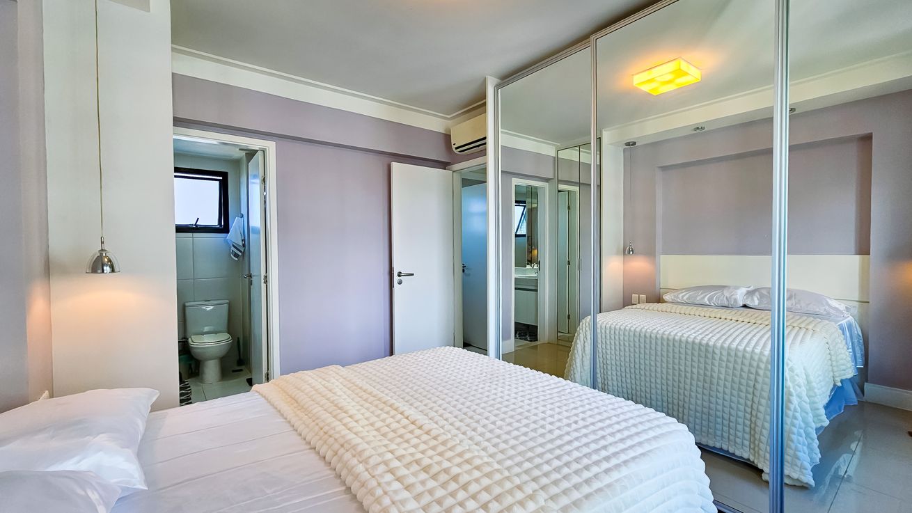 - Quarto 1(Suíte) muito bem ventilado, com cama de casal, ar-condicionado, armário, Smart TV, cortina blackout, luminárias ao lado da cama para leitura e banheiro privativo