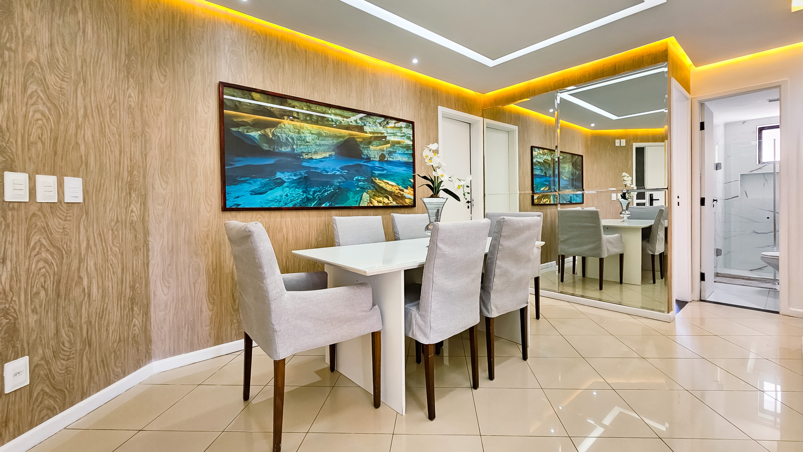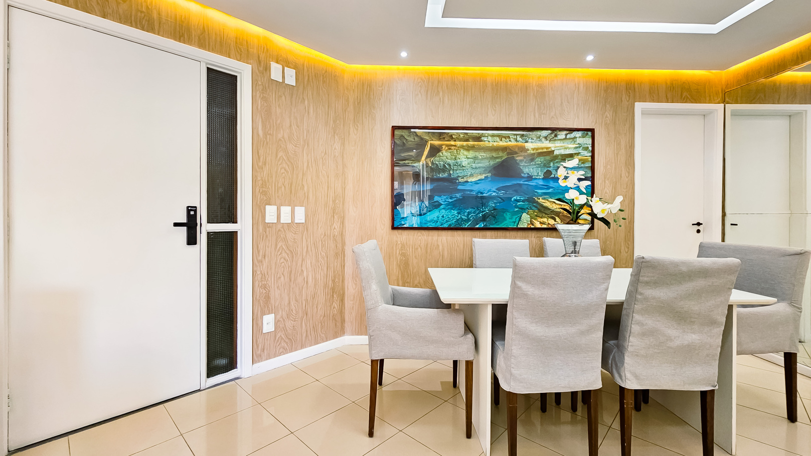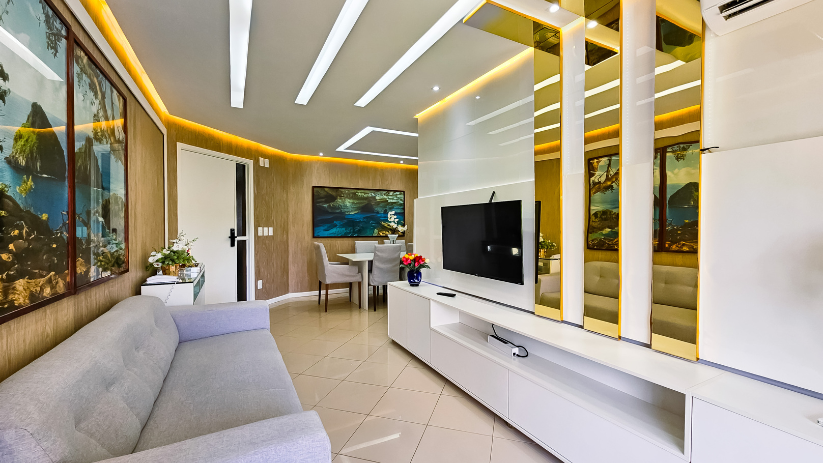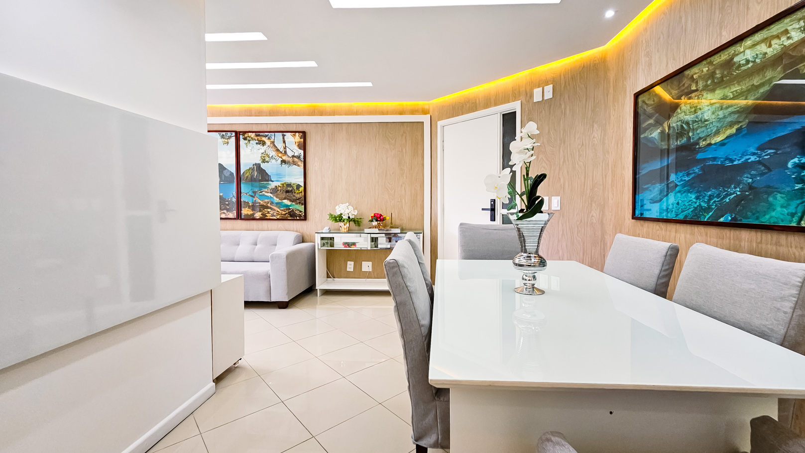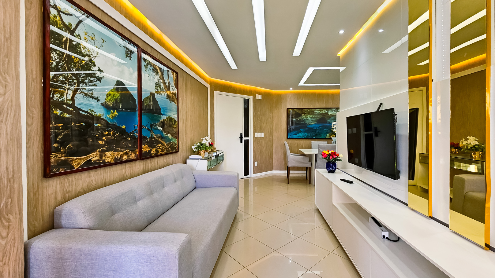 - Sala ampla com sofá, Smart TV, ar-condicionado, ventilador de teto e mesa de jantar