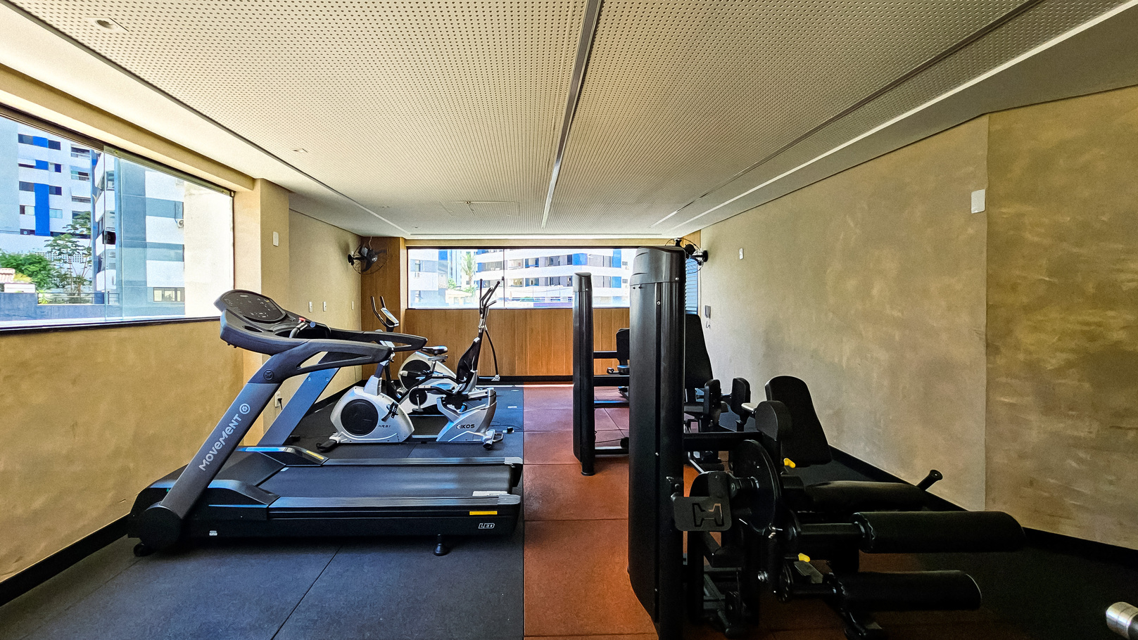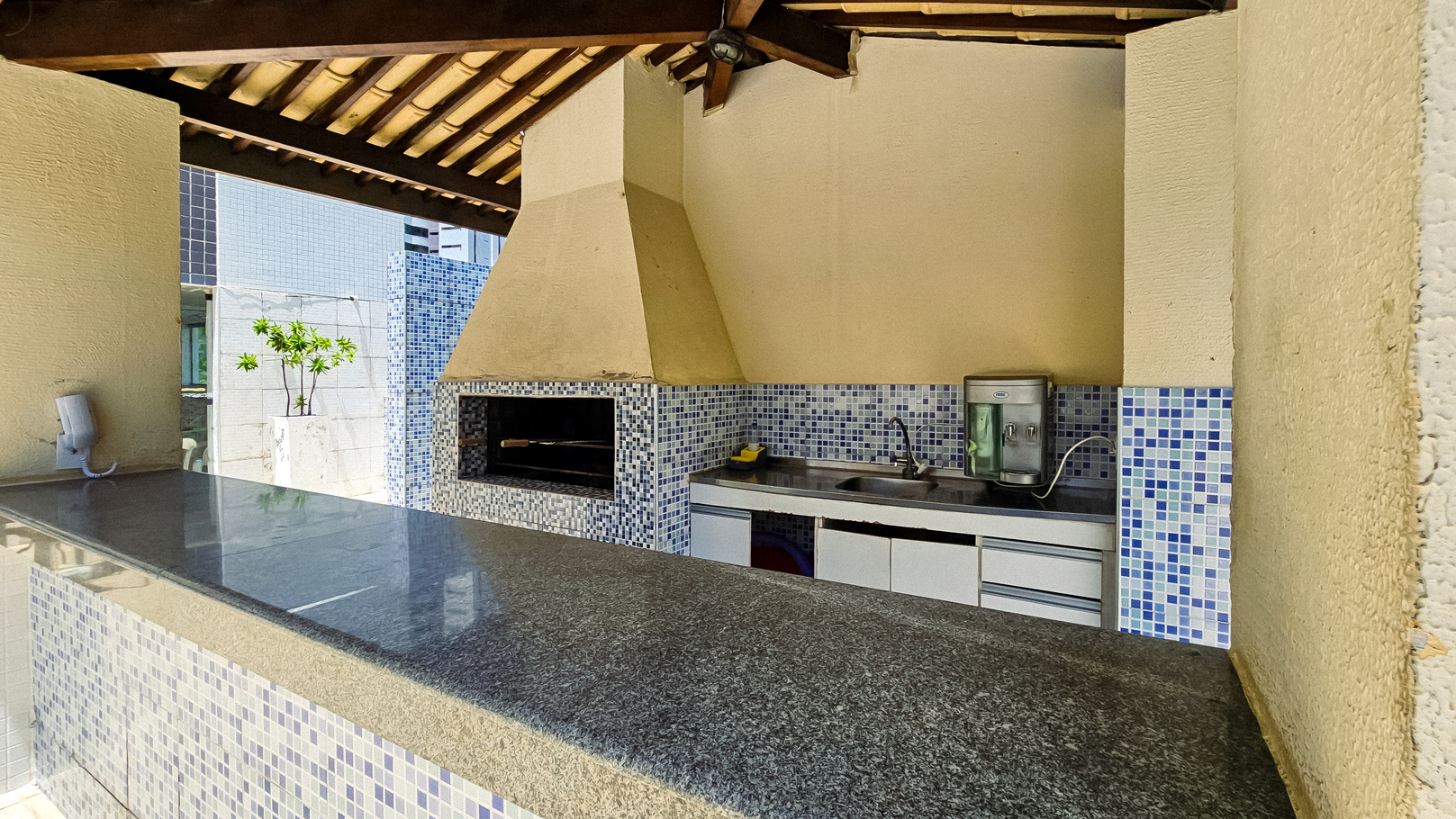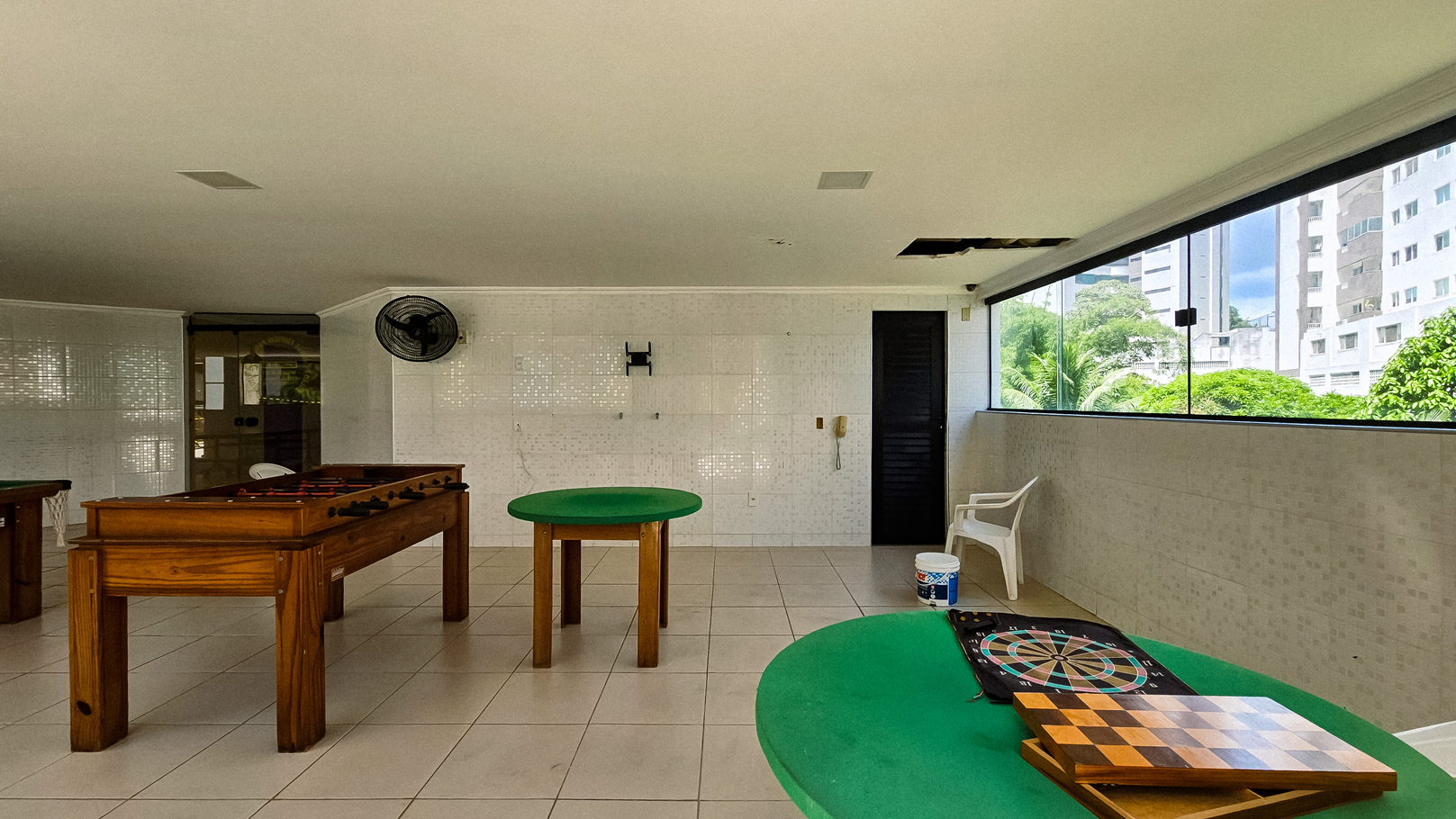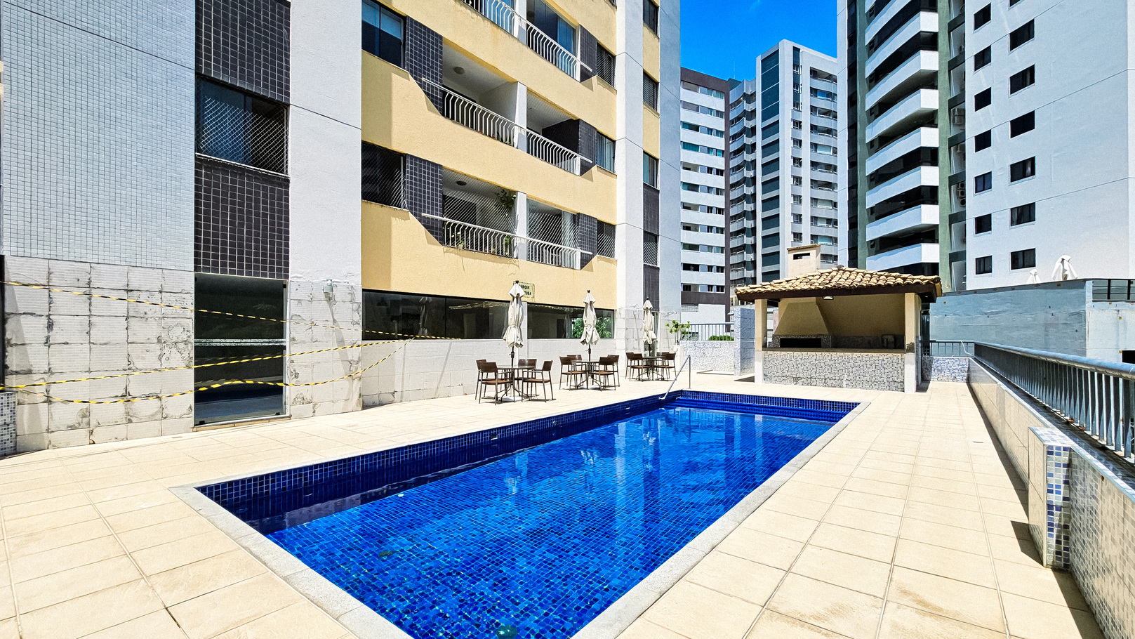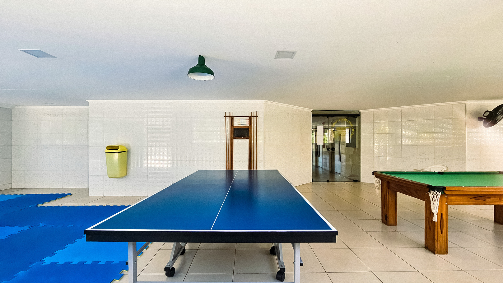 - Área de lazer no condomínio com piscina, academia, churrasqueira, quadra esportiva, salão de jogos e terraço