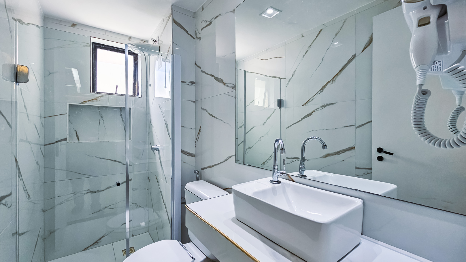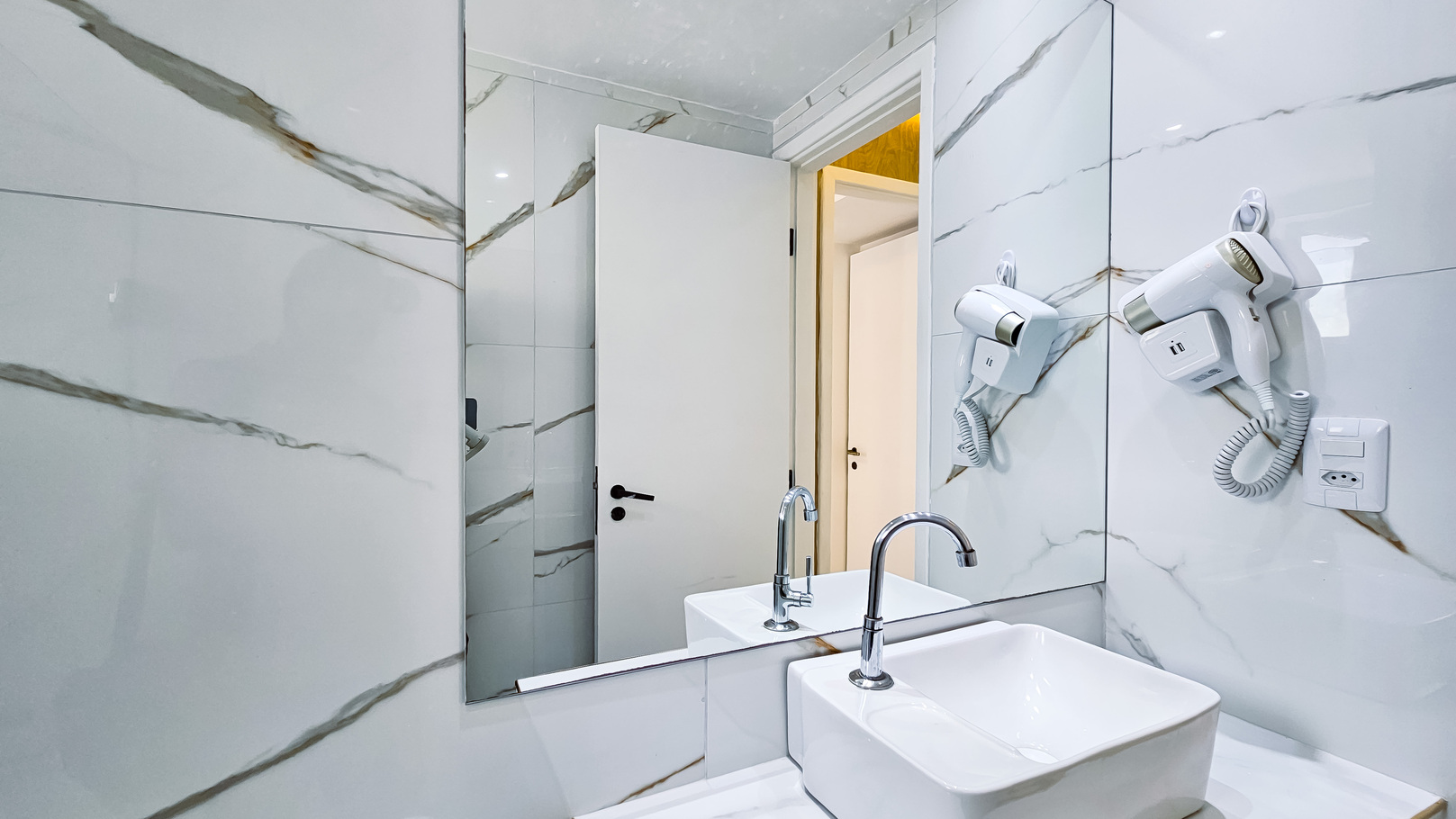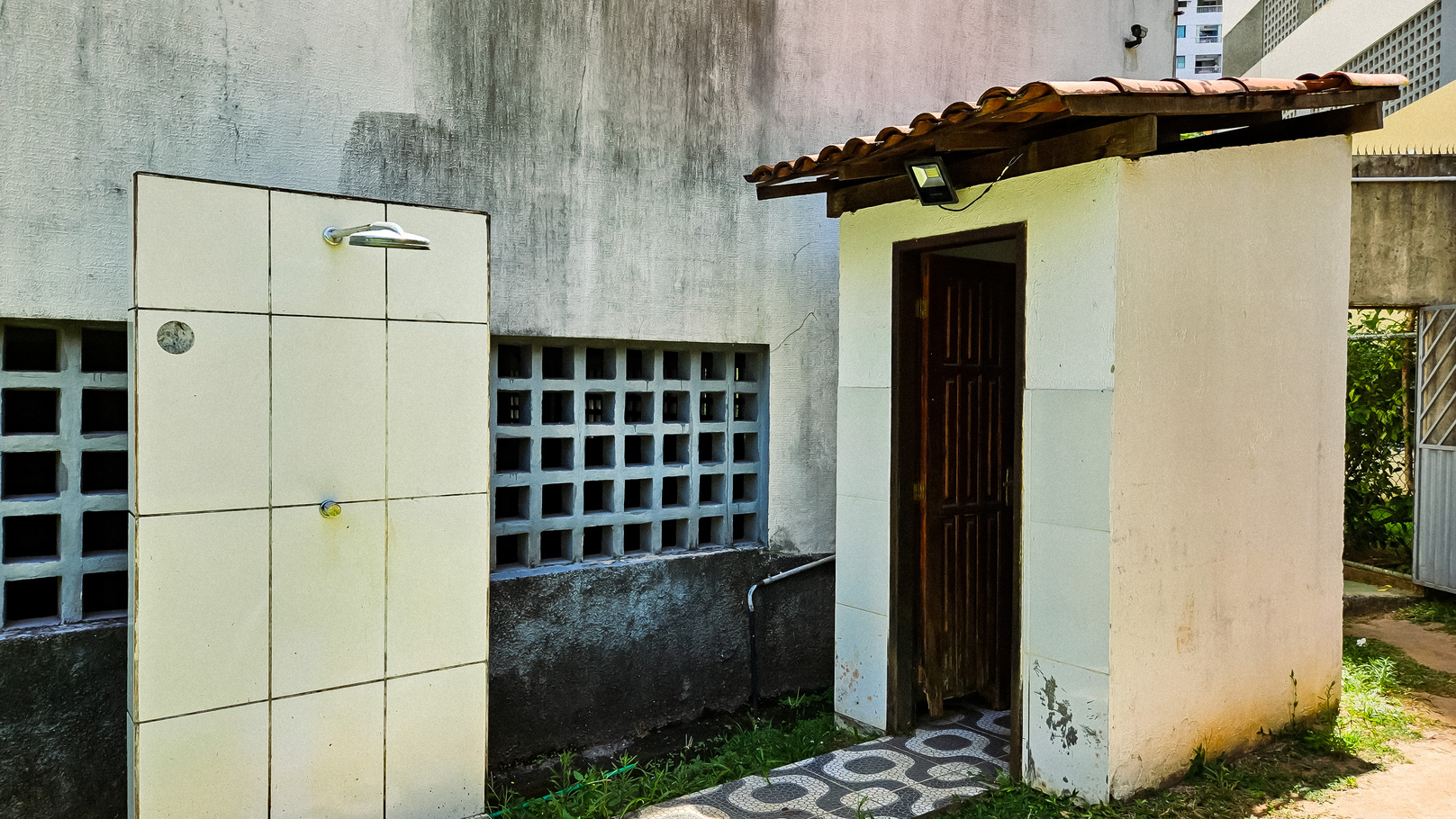 - Quarto 1 (suíte): cama de casal, ar-condicionado, armário, ventilador e banheiro privativo