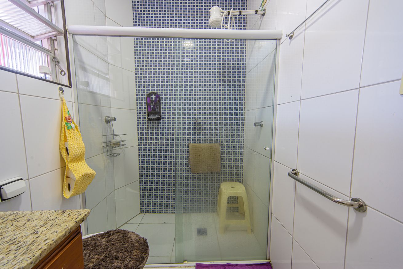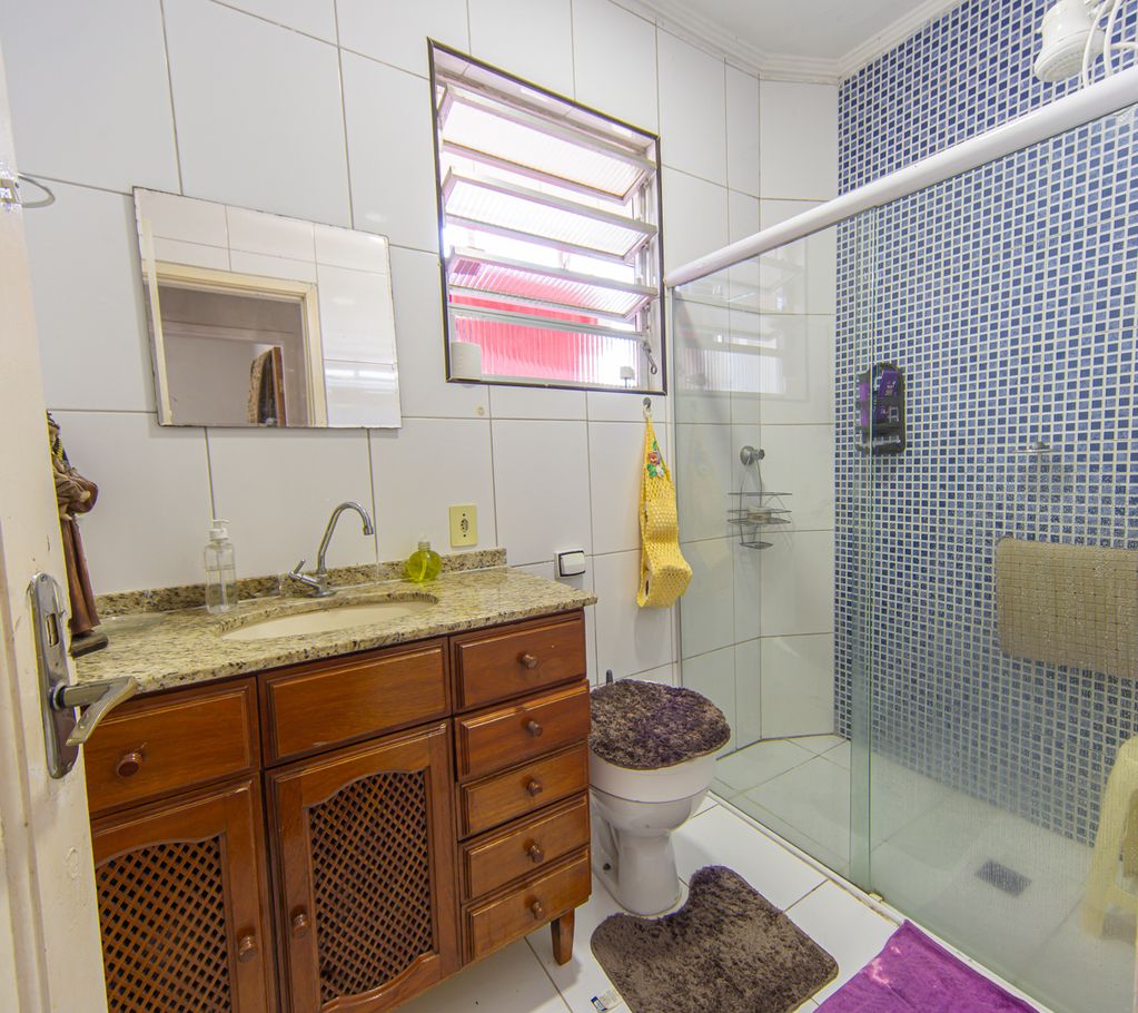 - Banheiro com chuveiro elétrico, box de vidro e secador de cabelo