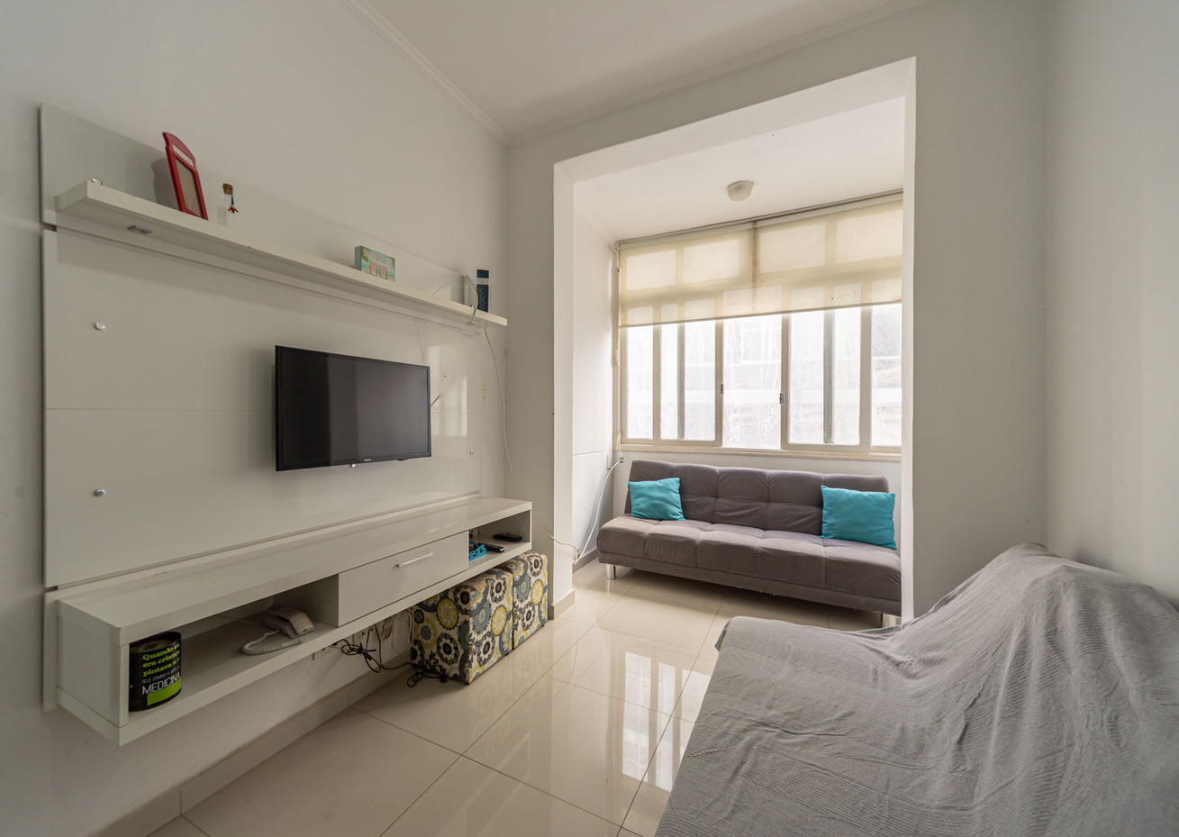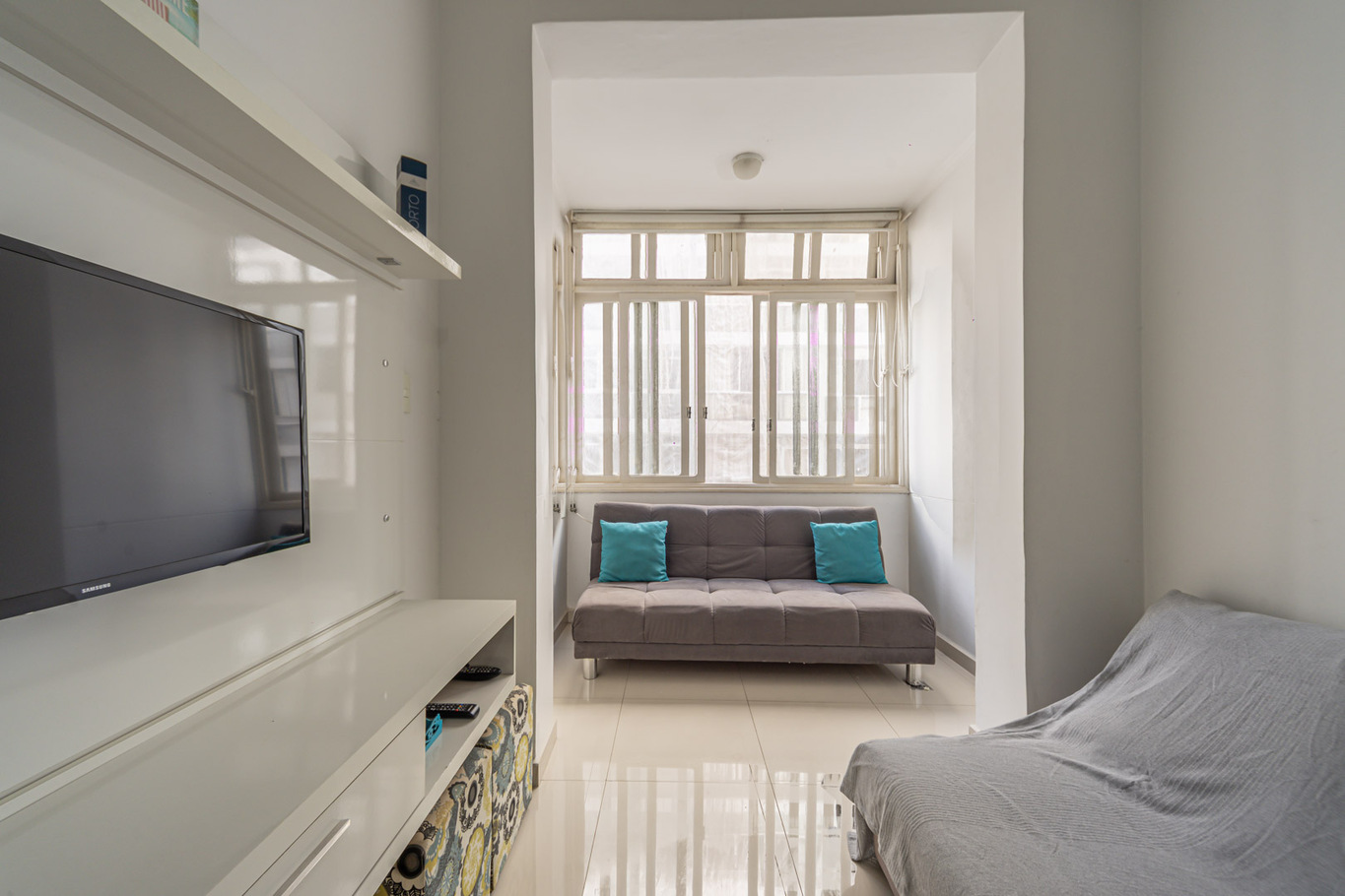 - Sala com sofá, sofá-cama, Smart TV e mesa de jantar