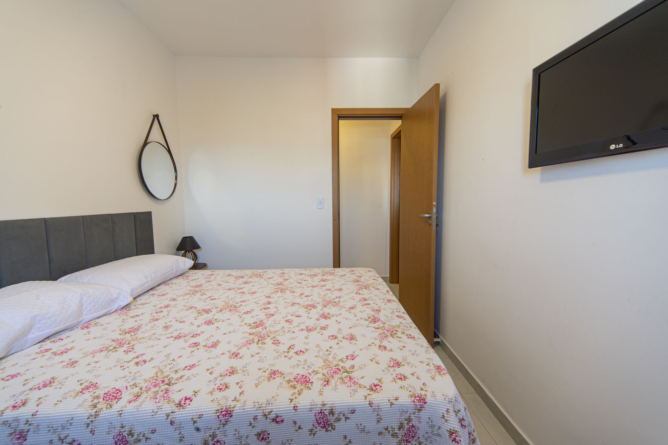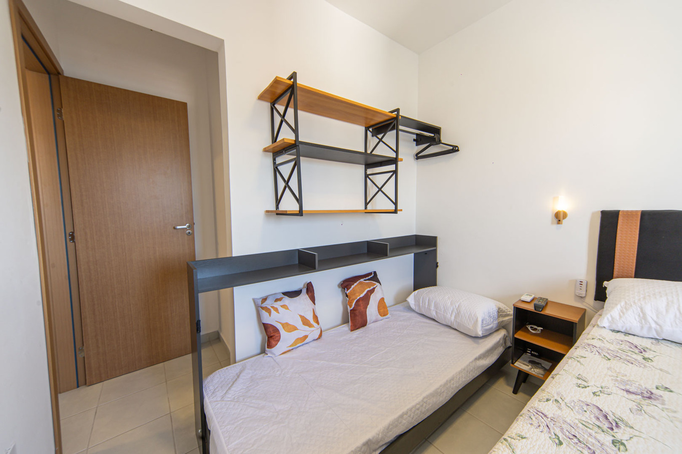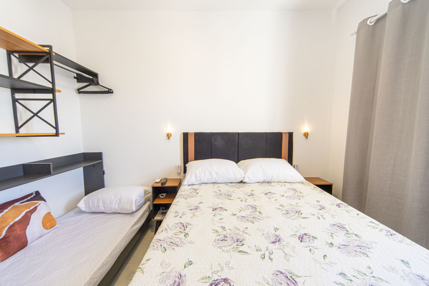 - Quarto 1: cama de casal, cama de solteiro retrátil, TV, armário
