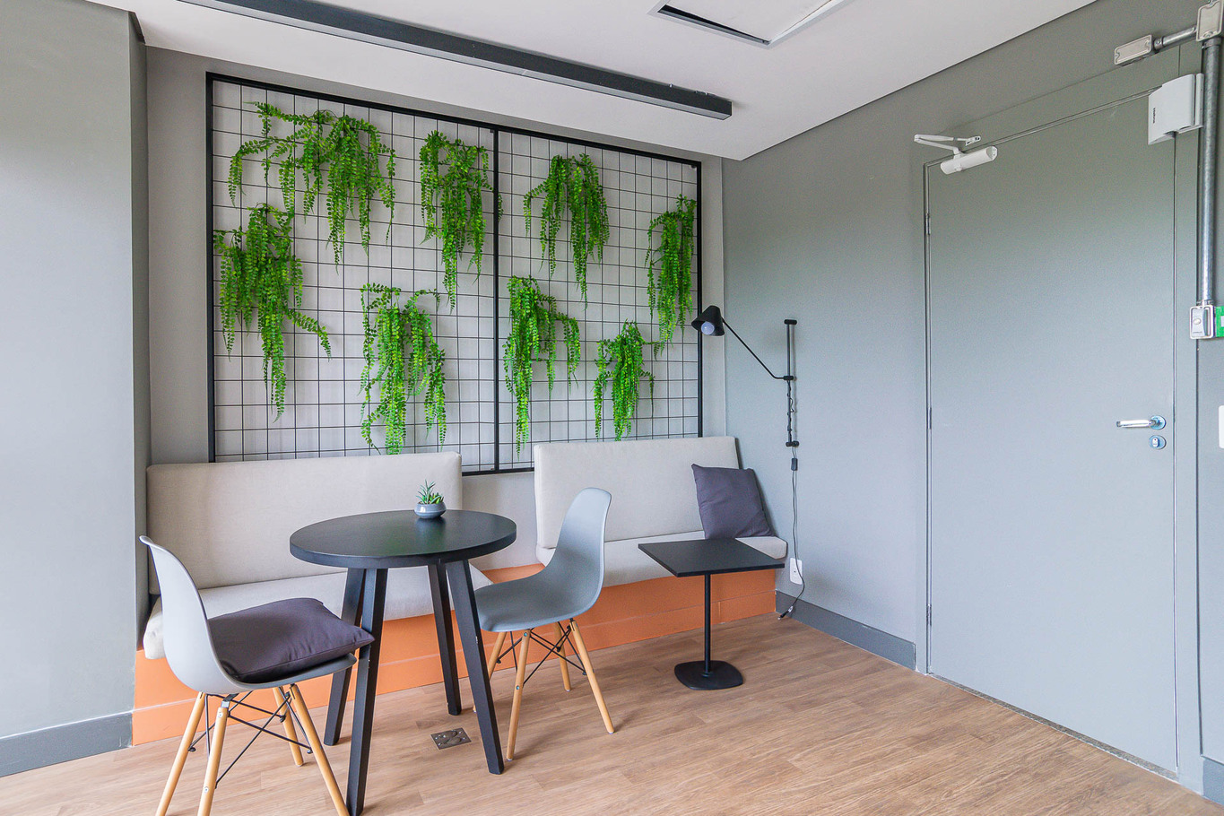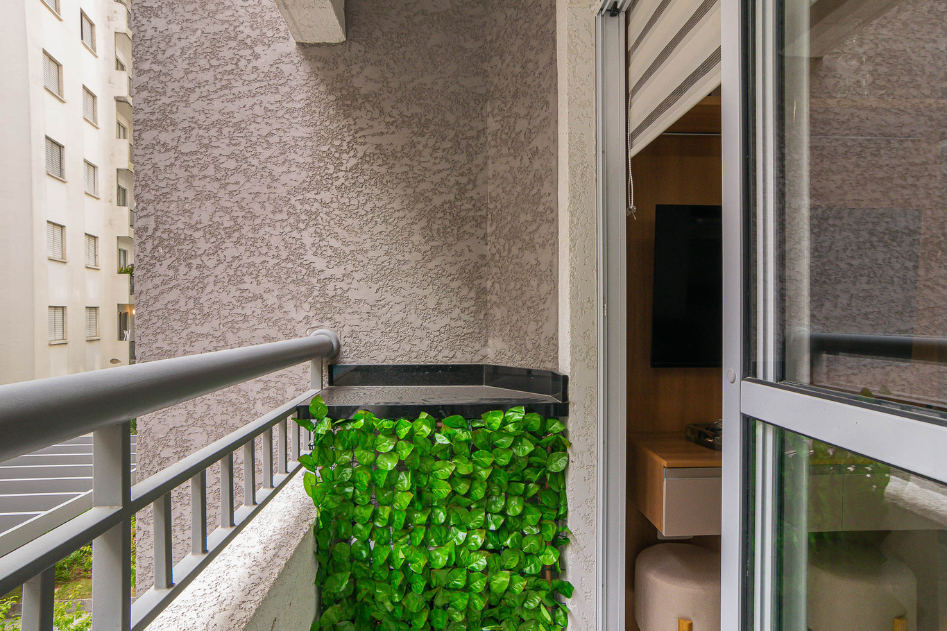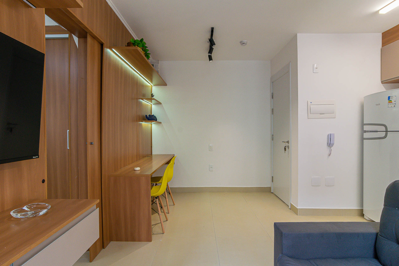 - Sala com sofá, Smart TV, TV a cabo e bancada de trabalho