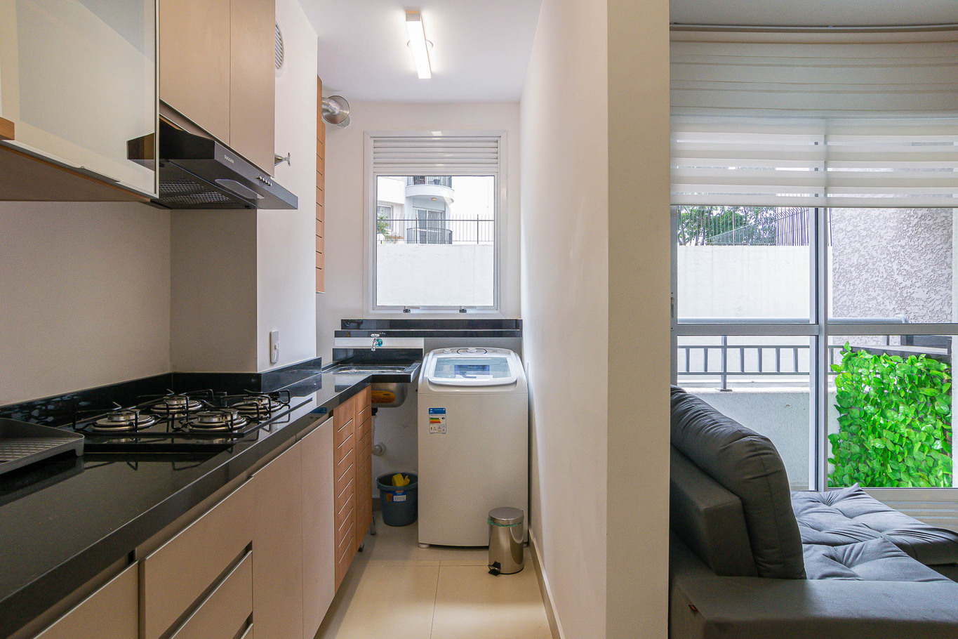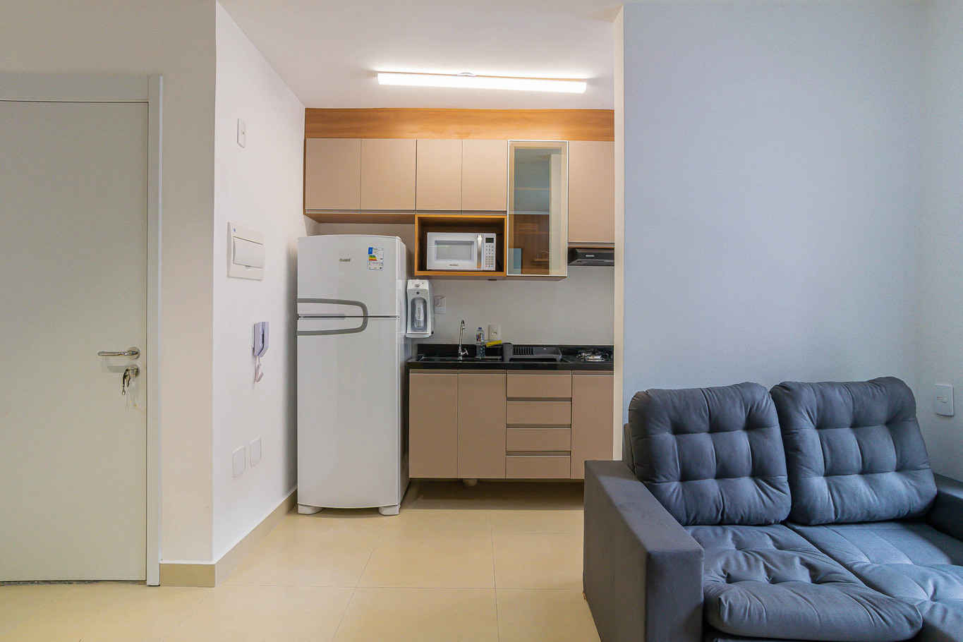 - Cozinha equipada com geladeira, fogão, micro-ondas, cafeteira, liquidificador, máquina de lavar louça,purificador de água e utensílios de cozinha(exceto óleo e sal)