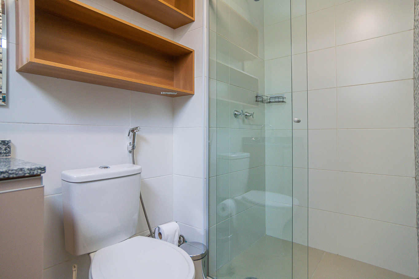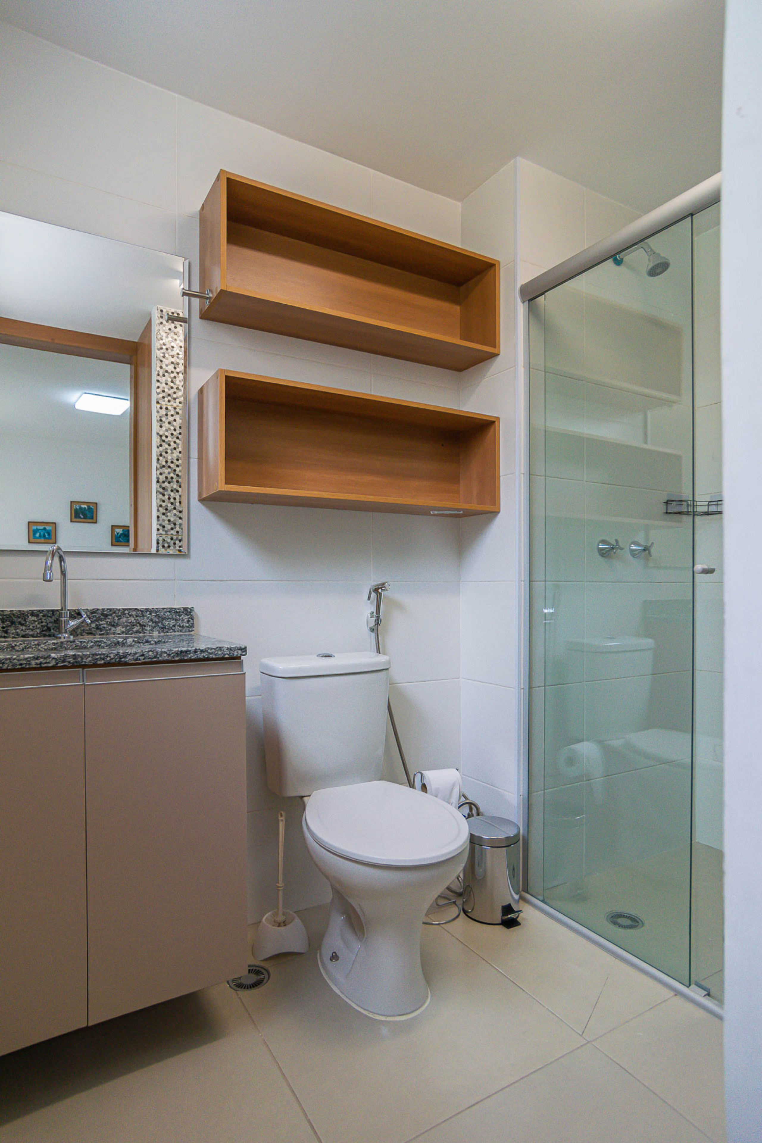 - Banheiro com chuveiro a gás, box de vidro e secador de cabelo