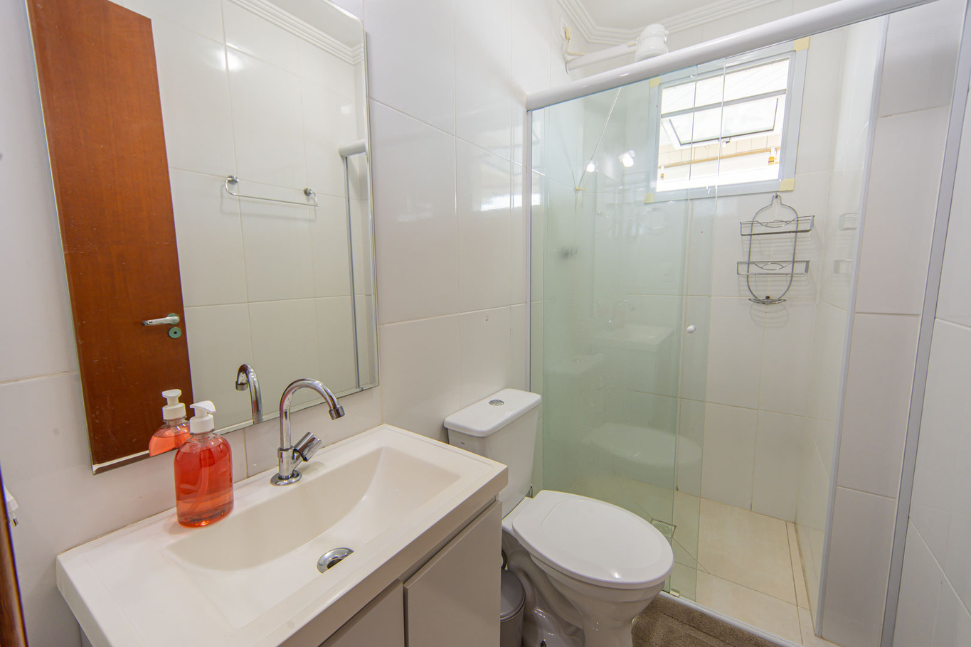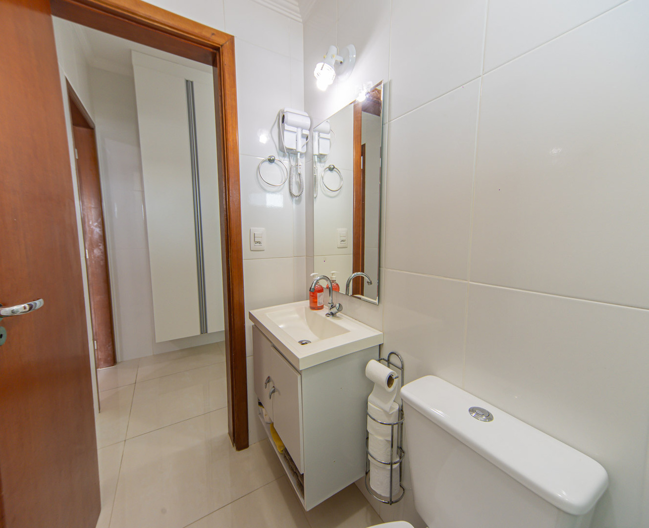 - Banheiro com box de vidro, chuveiro elétrico e secador de cabelo
