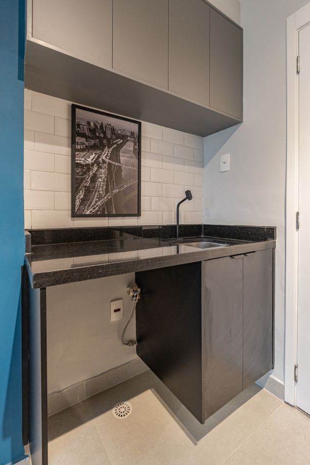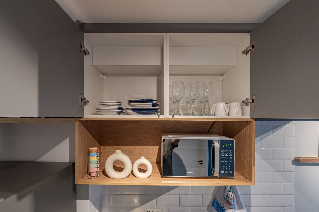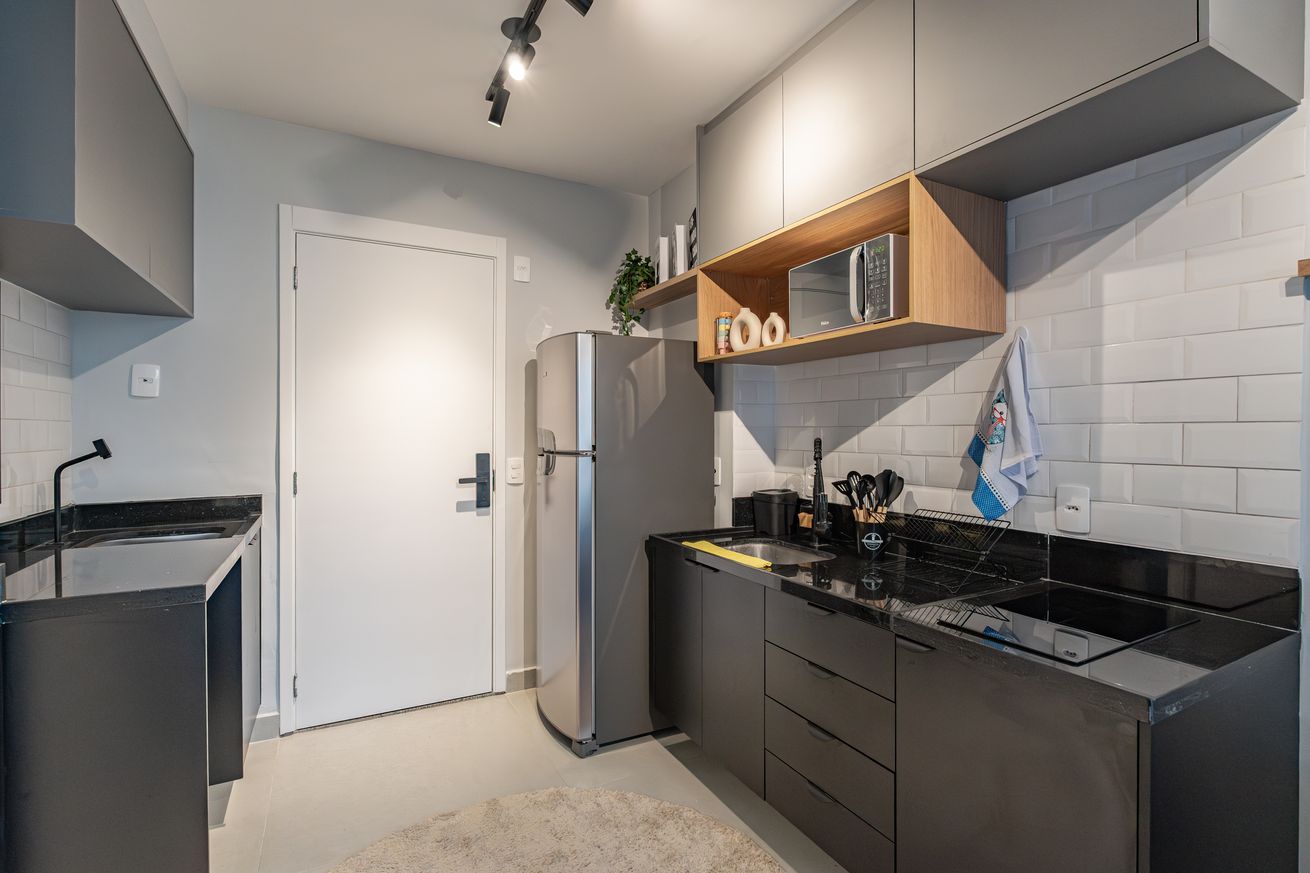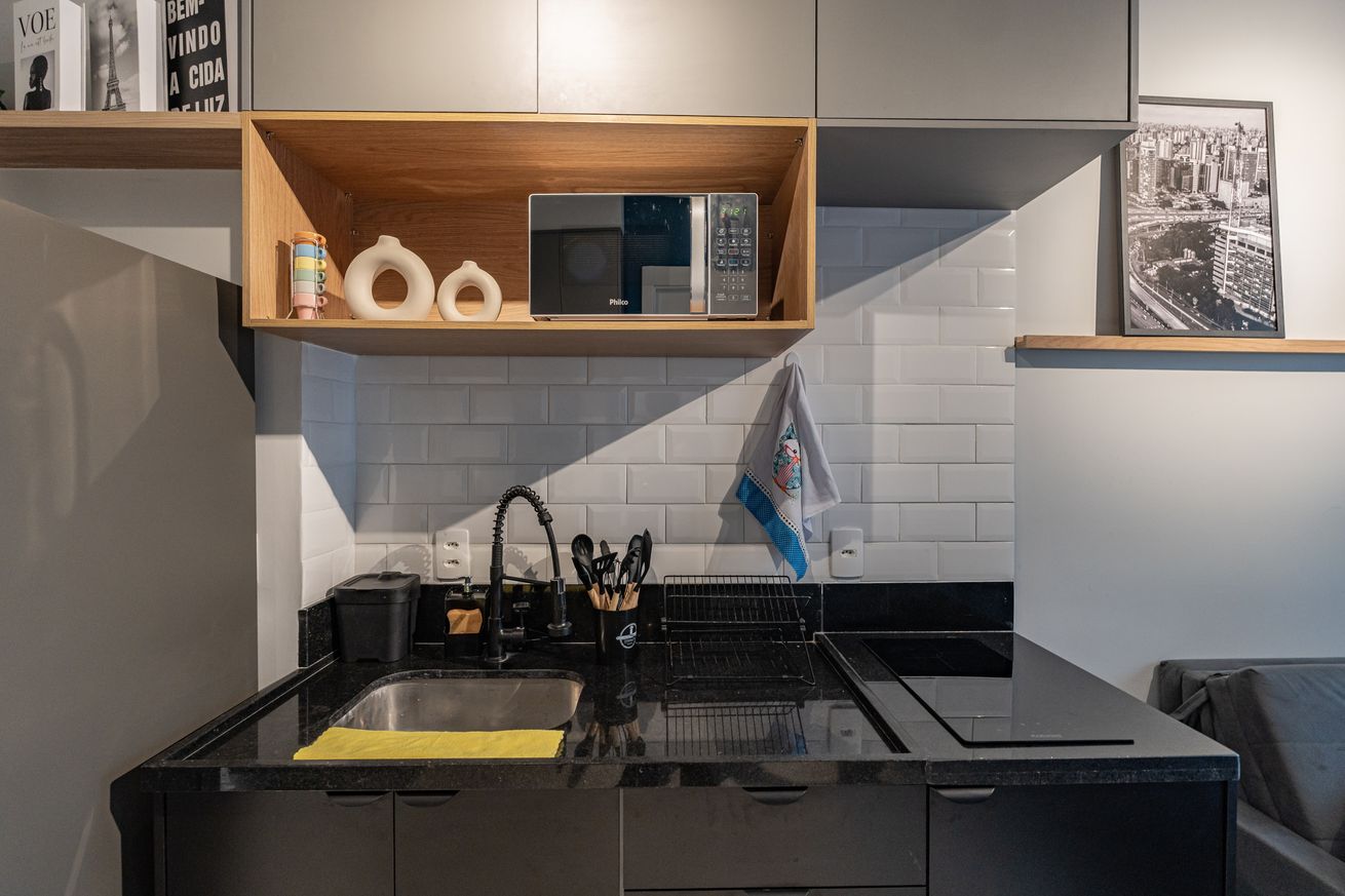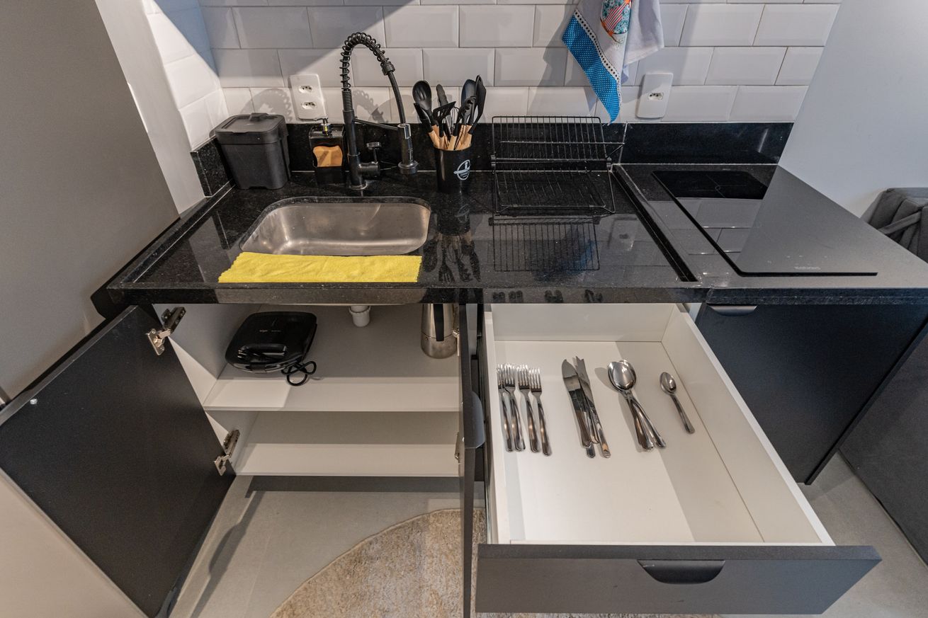 - Cozinha compacta e bem equipada, integrada ao ambiente, com balcão de apoio para refeições rápidas, cooktop por indução (2 bocas), geladeira, microondas, cafeteira, torradeira, utensílios e itens básicos