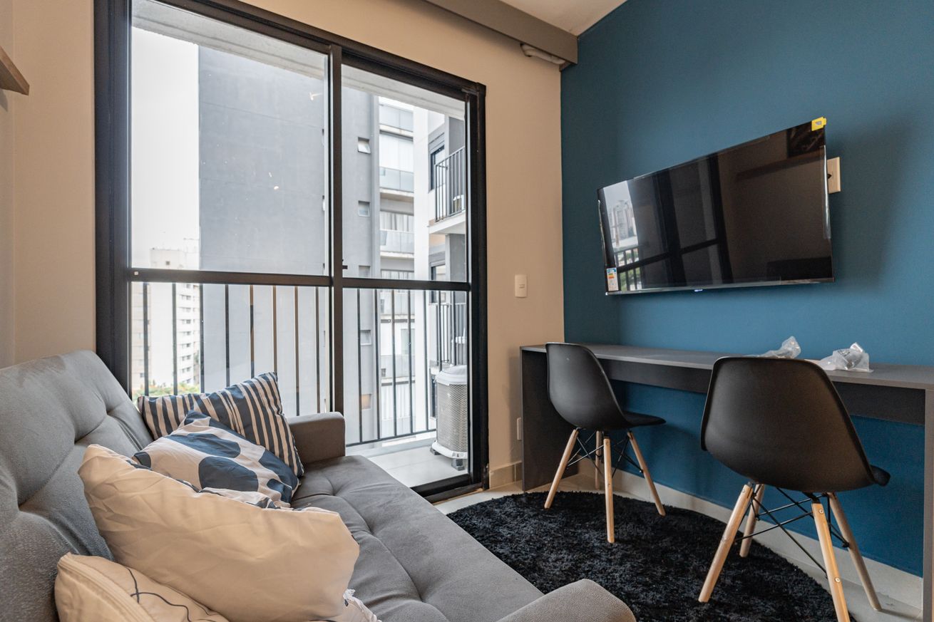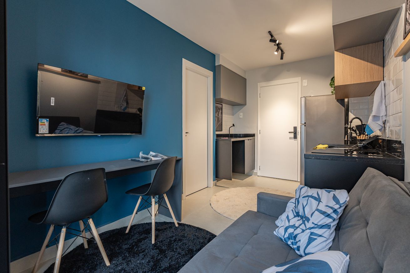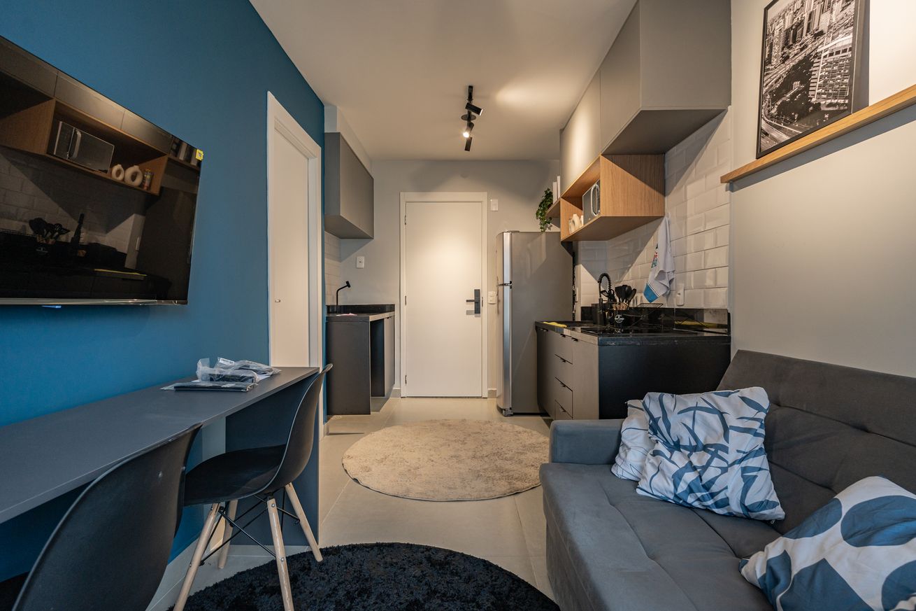 - Ambiente integrado e funcional com sofá confortável, TV, ar-condicionado, varanda, boa iluminação e layout otimizado para aproveitar bem o espaço