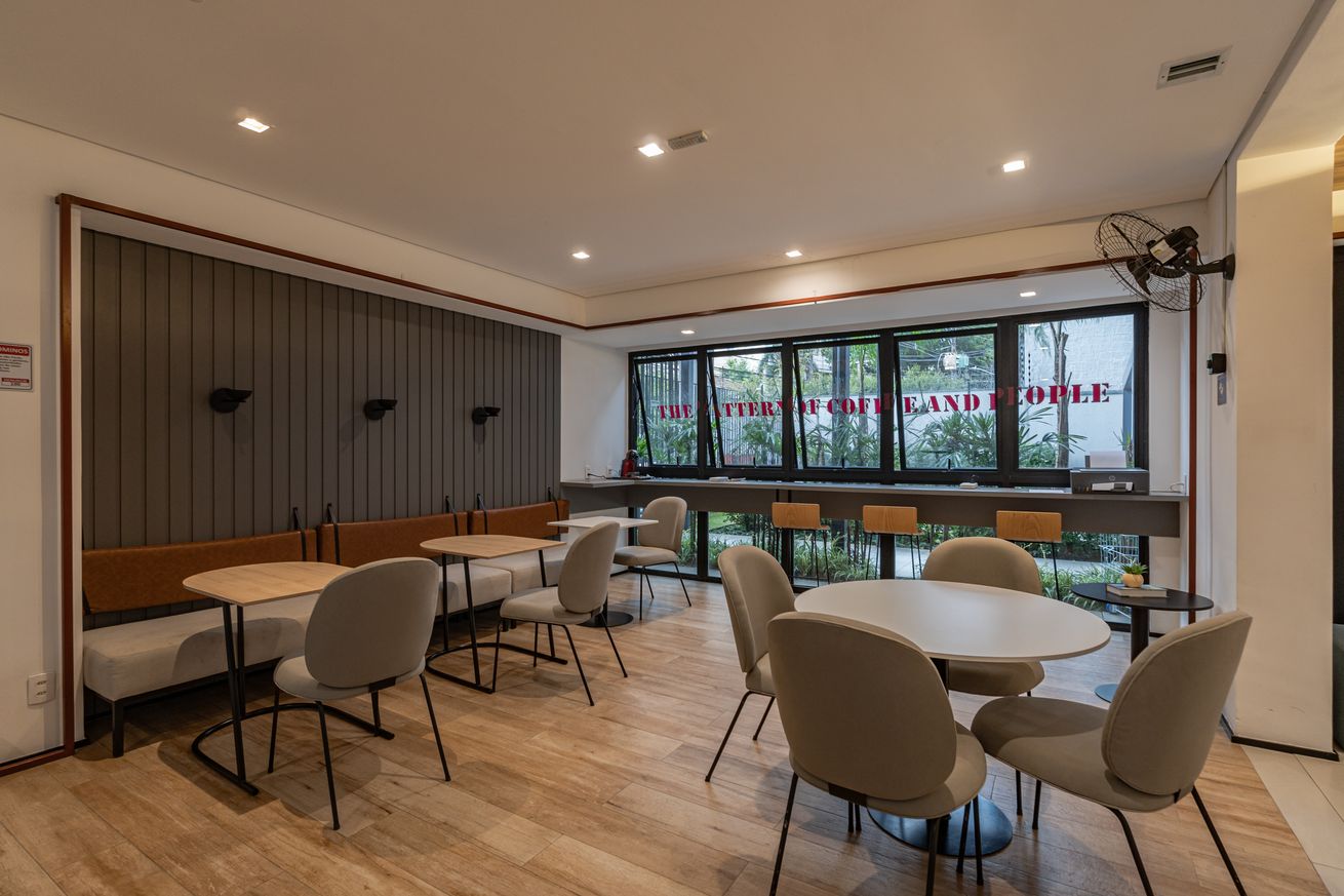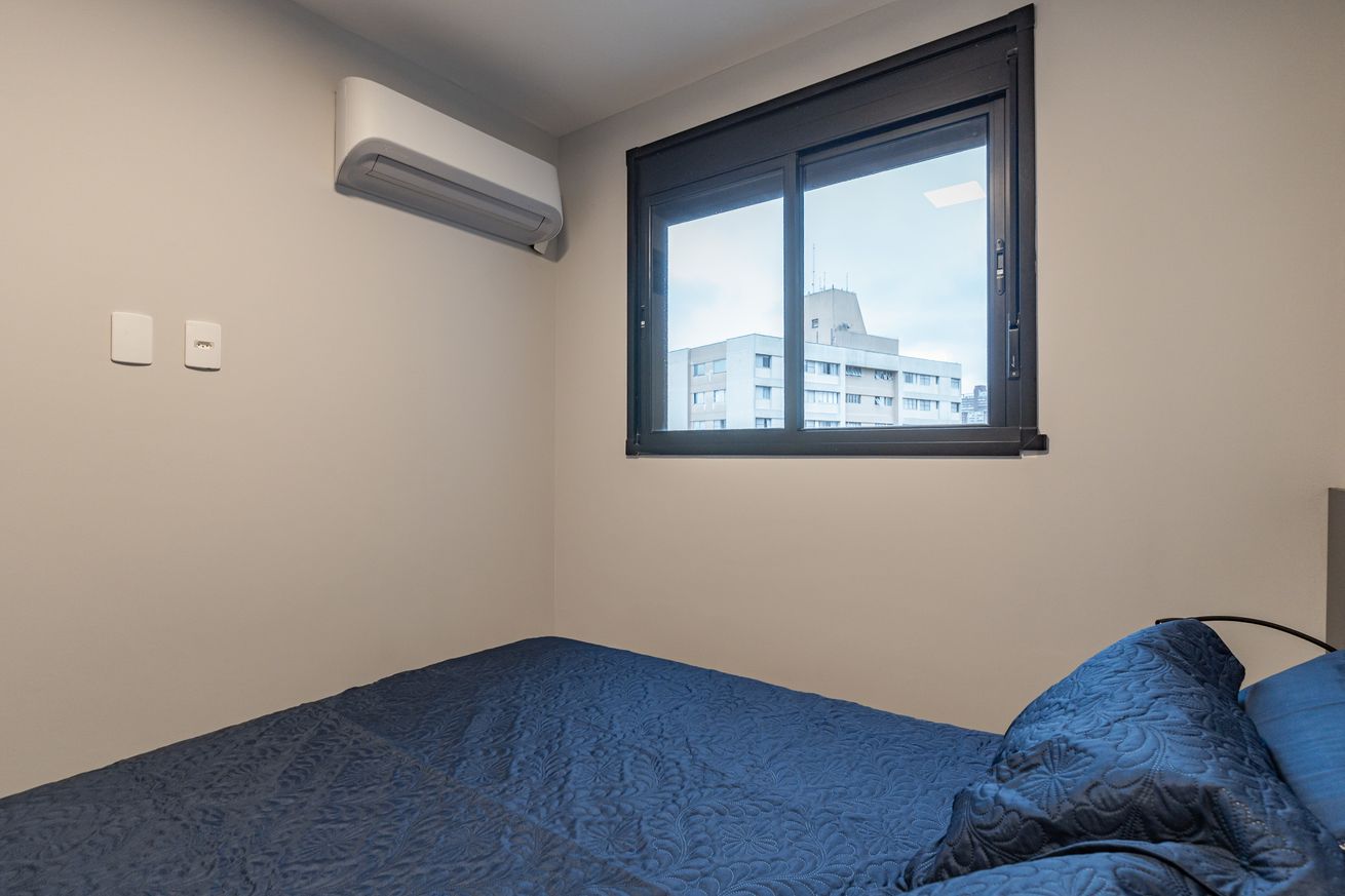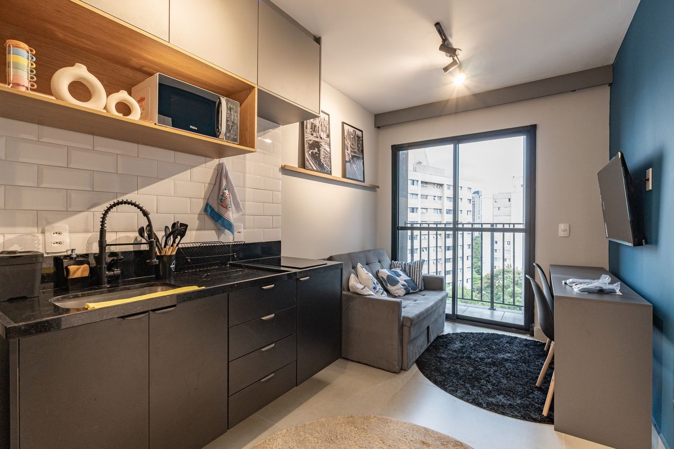 - Ambiente integrado e funcional com sofá confortável, TV, ar-condicionado, varanda, boa iluminação e layout otimizado para aproveitar bem o espaço