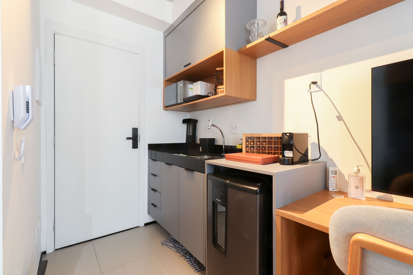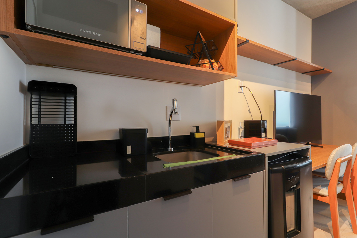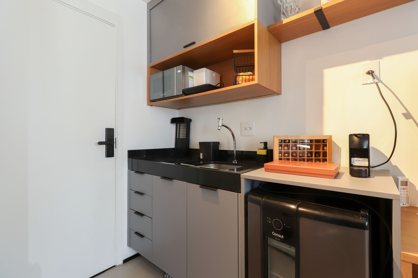 - Cozinha equipada com fogão, geladeira, micro-ondas e cafeteira