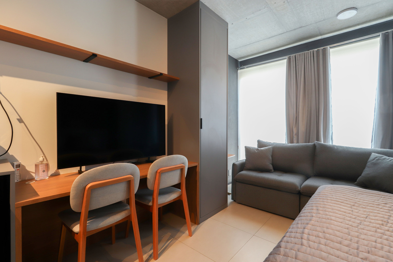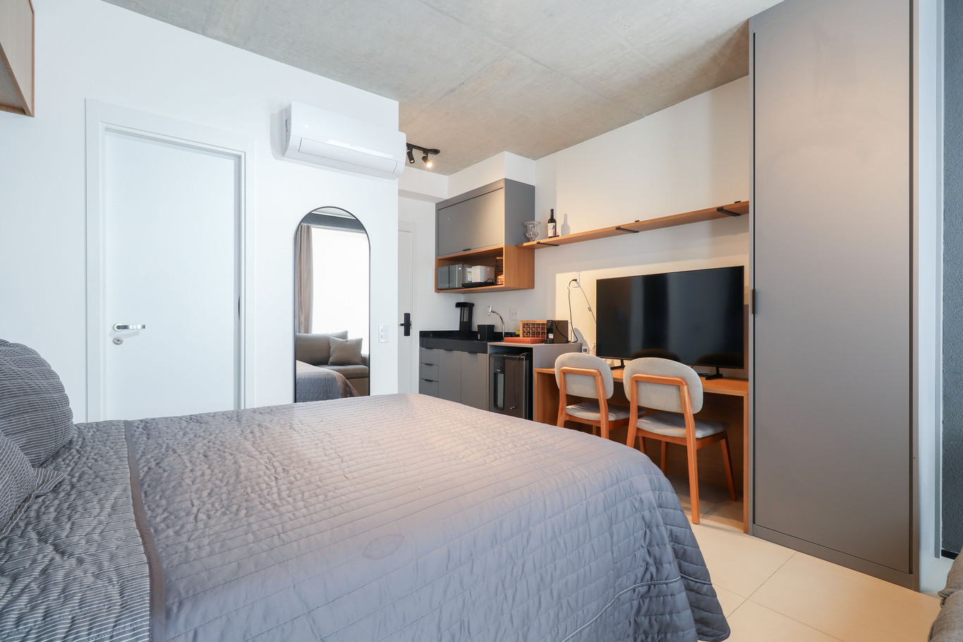 - Sala com sofá-cama, Smart TV e ar-condicionado