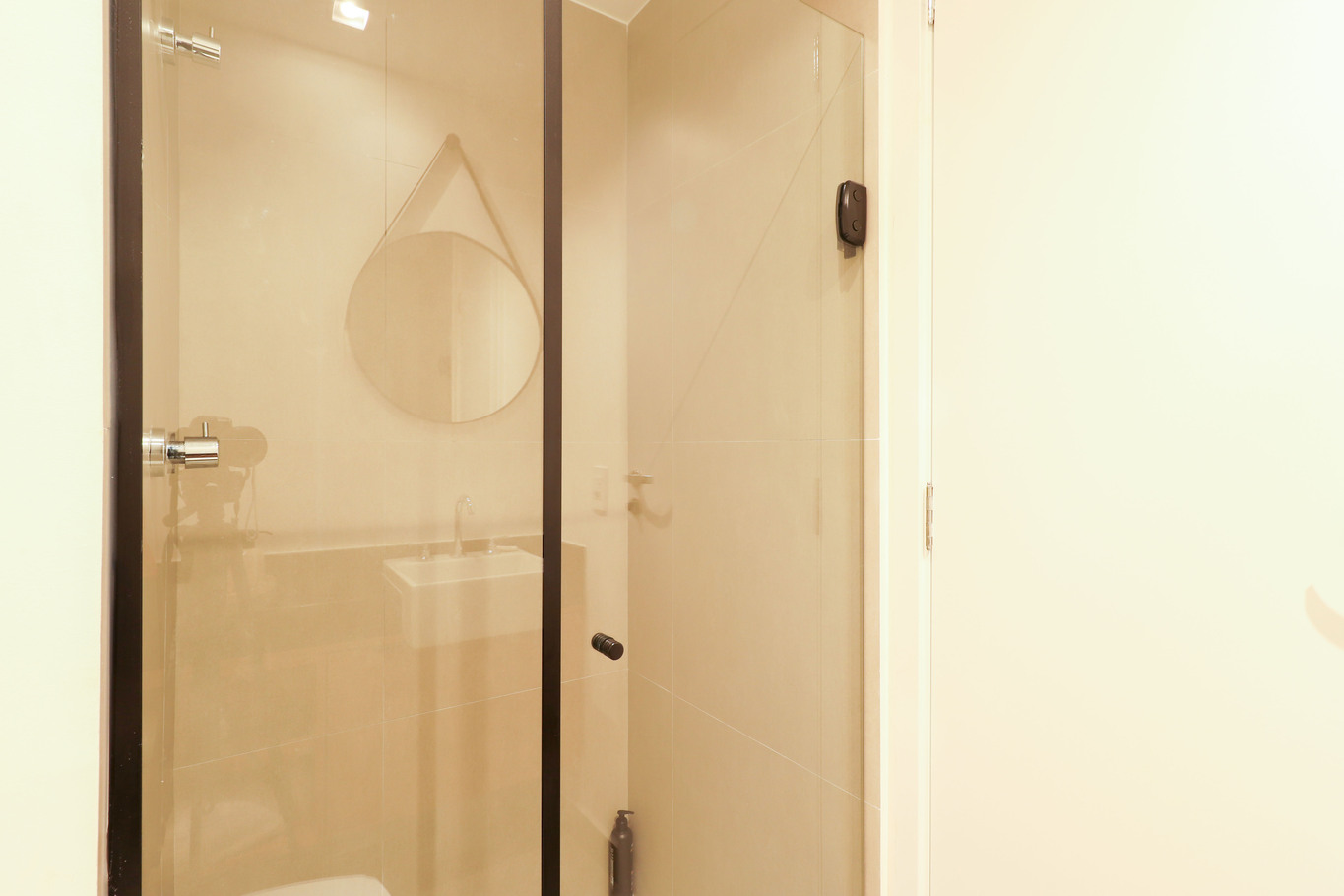 - Banheiro com chuveiro a gás, box de vidro e secador de cabelo