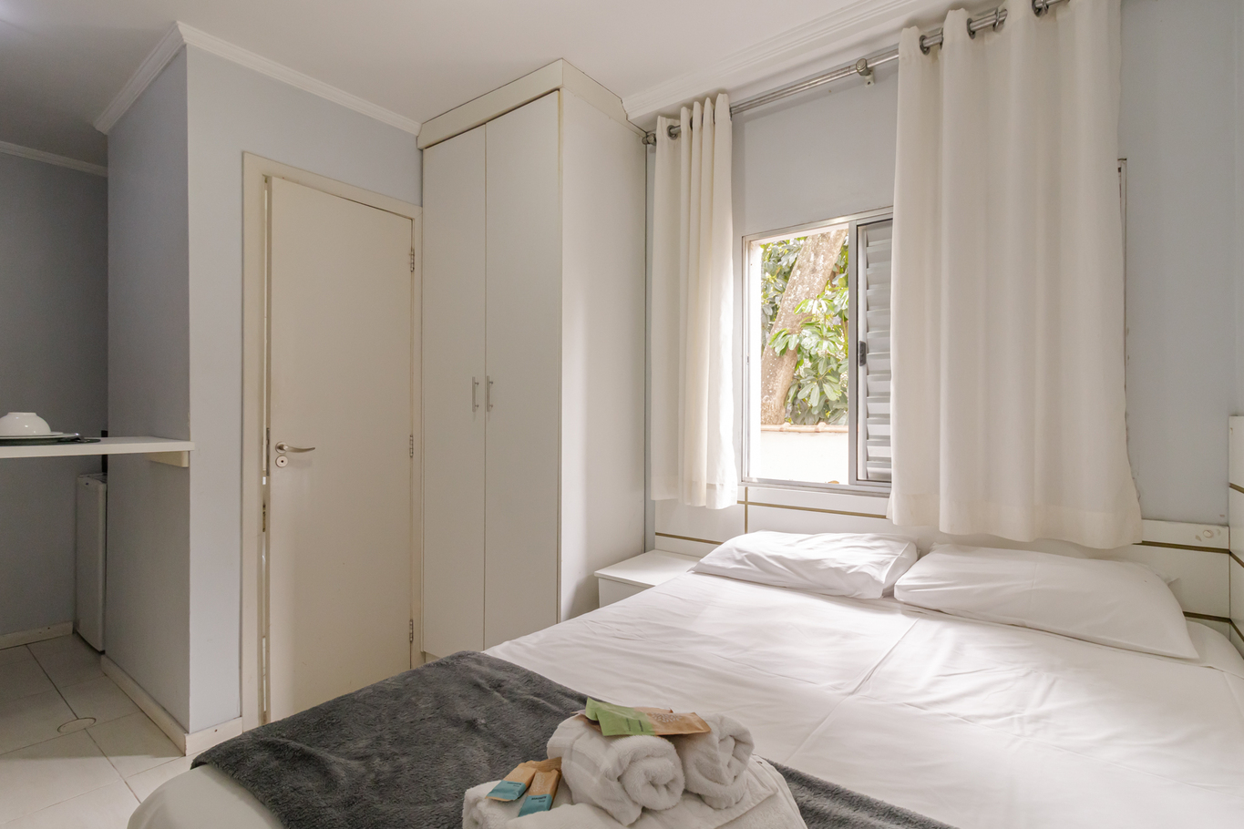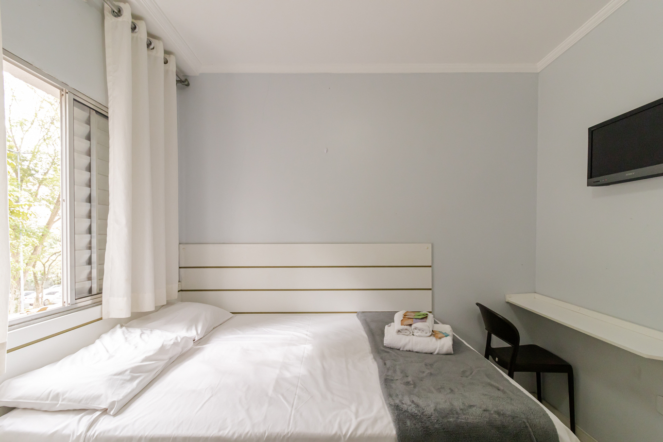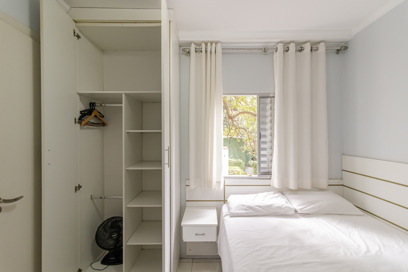 - Quarto com cama de casal, armário, mesa multifuncional, protetor de colchão e ventilador de teto