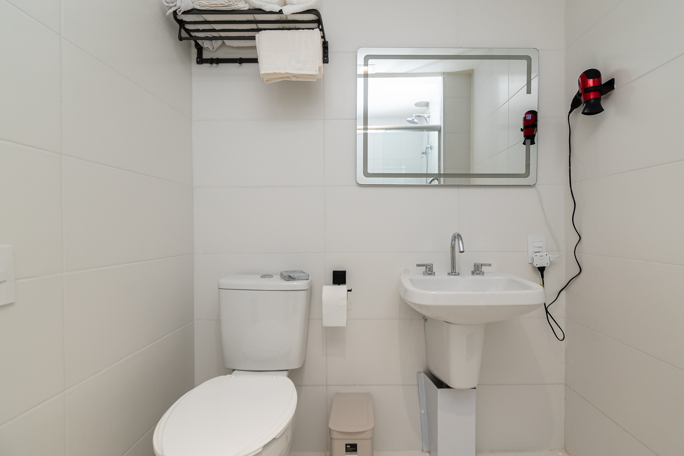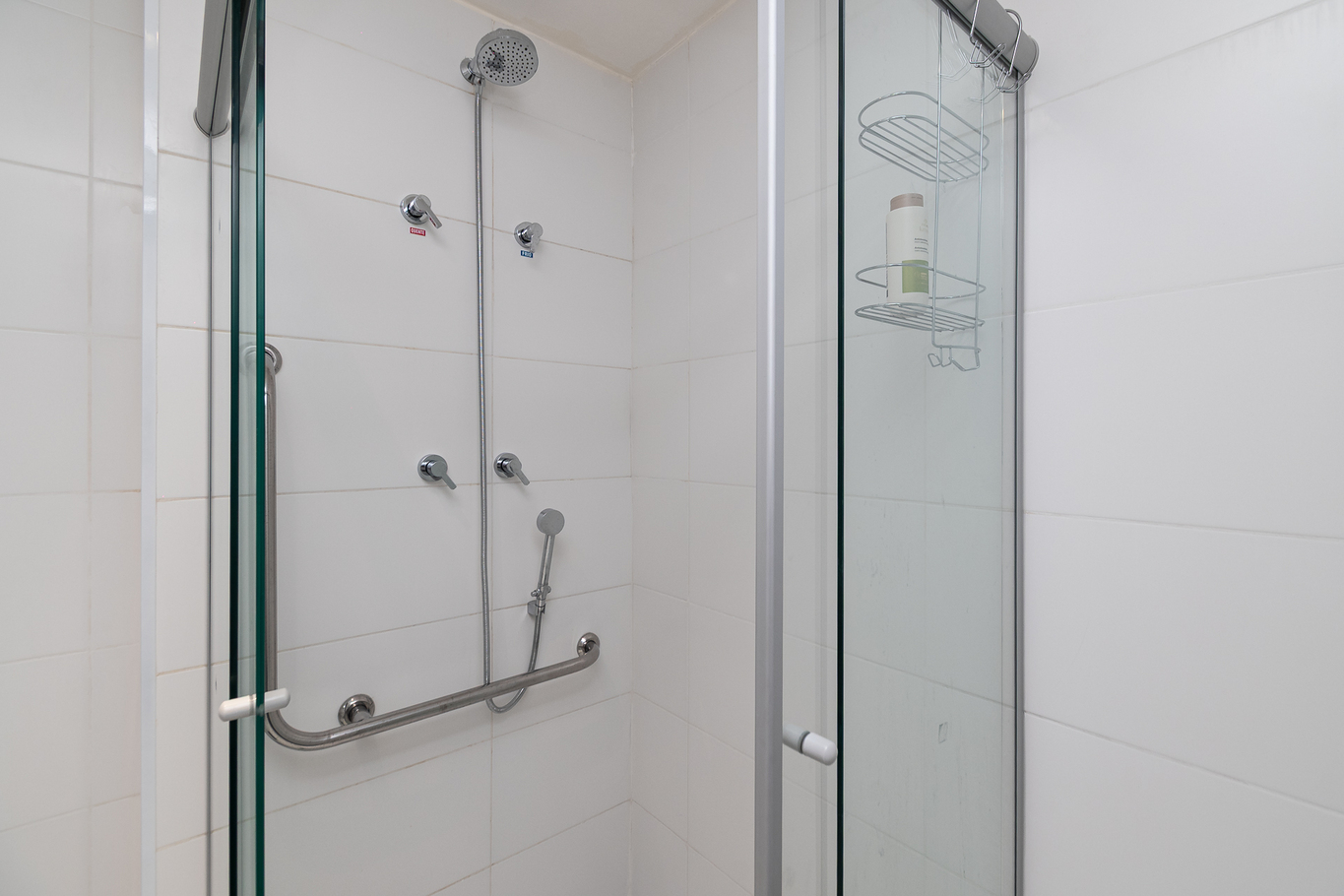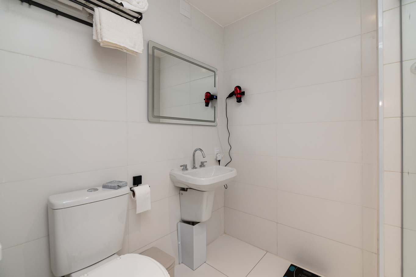 - Banheiro com box de vidro/acrílico e chuveiro elétrico