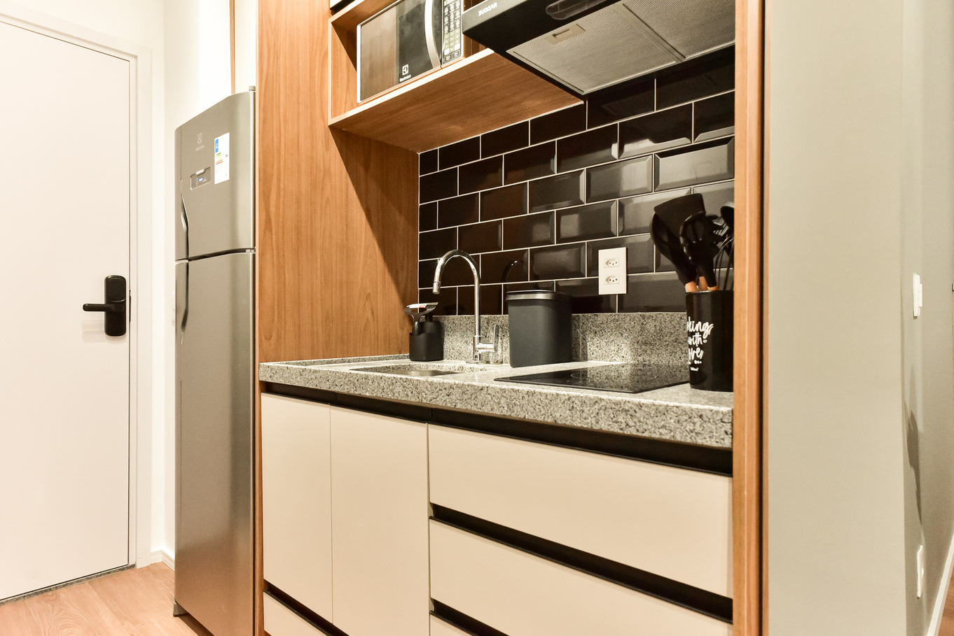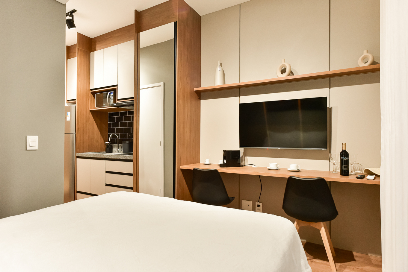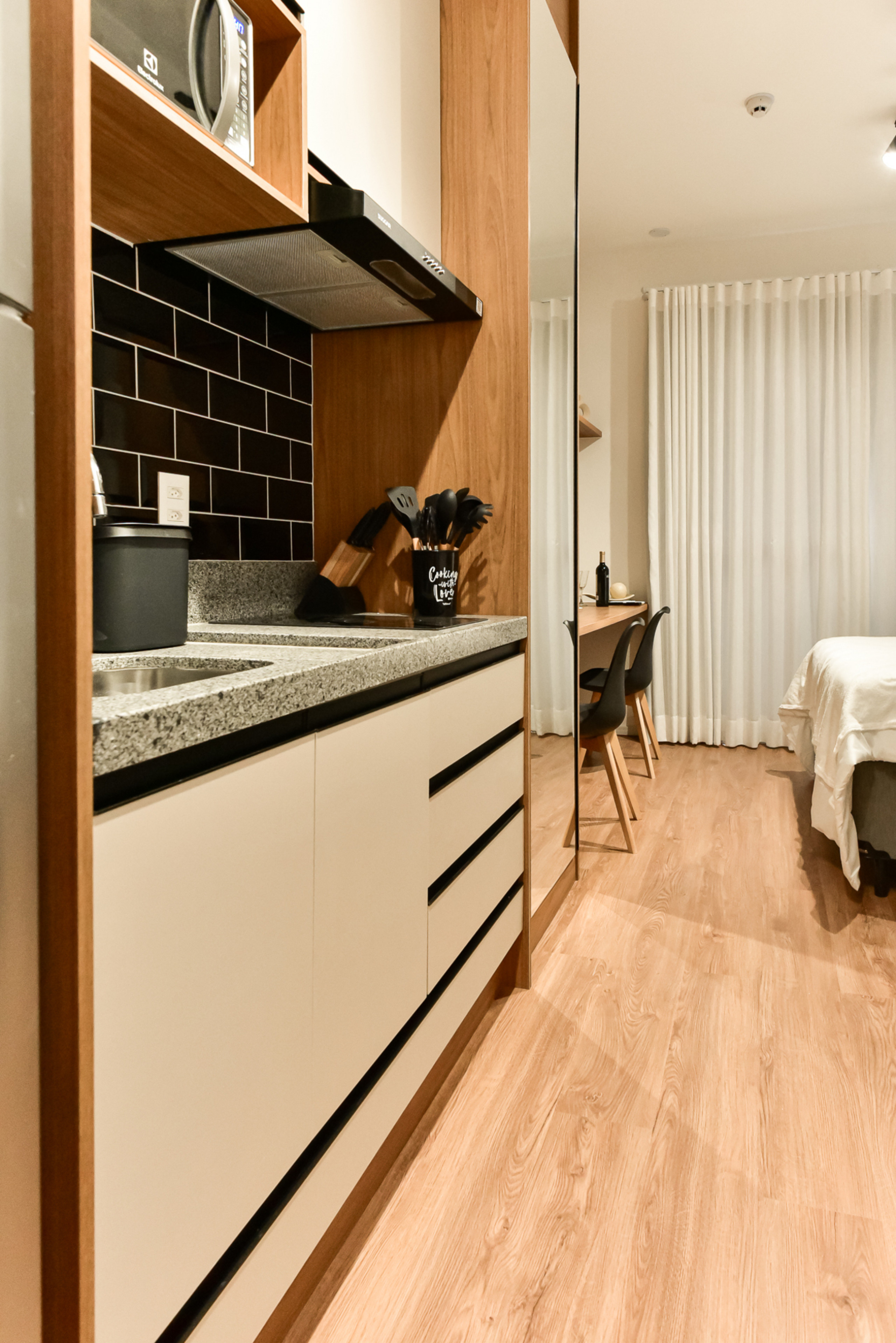 - Cozinha equipada com fogão, geladeira, microondas, cafeteira, chaleira e purificador de água e utensílios diversos(exceto óleo e sal)