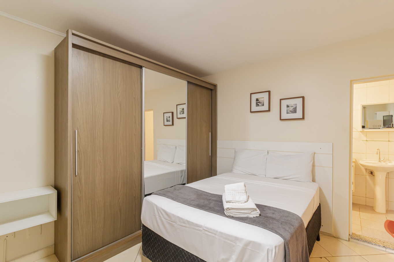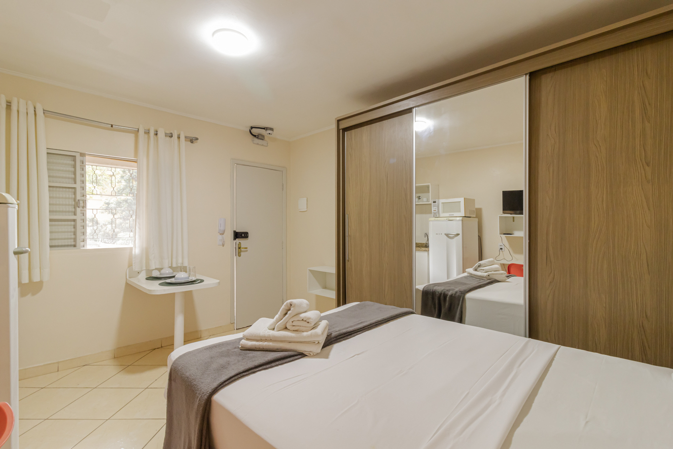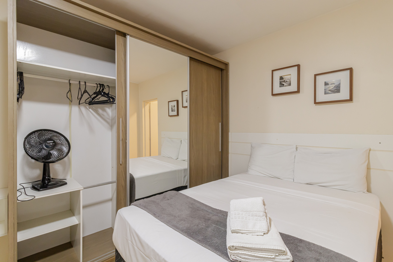 - Quarto com cama de casal, armário, mesa multifuncional e protetor de colchão