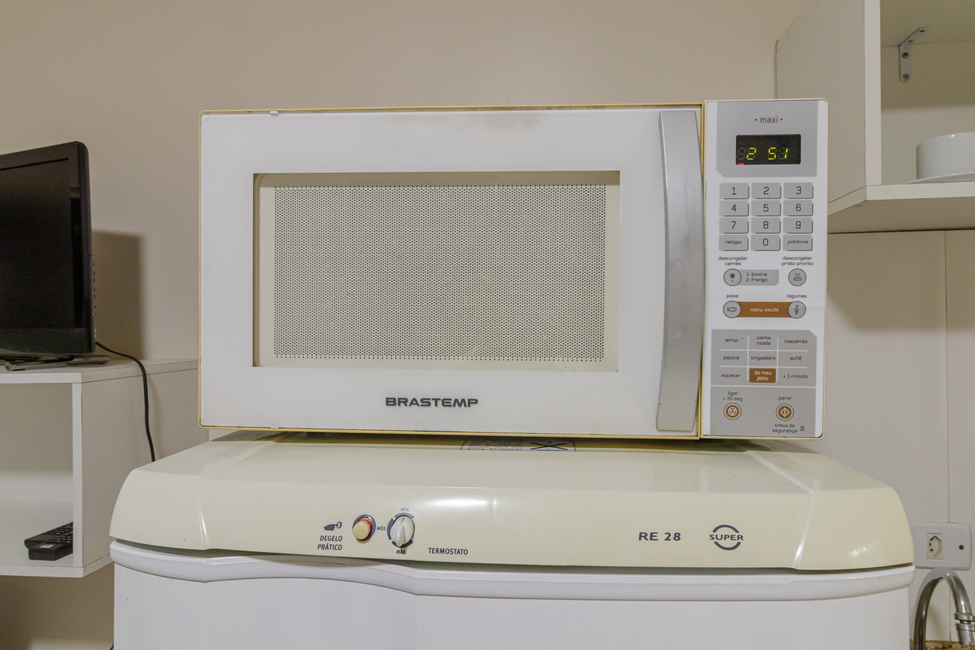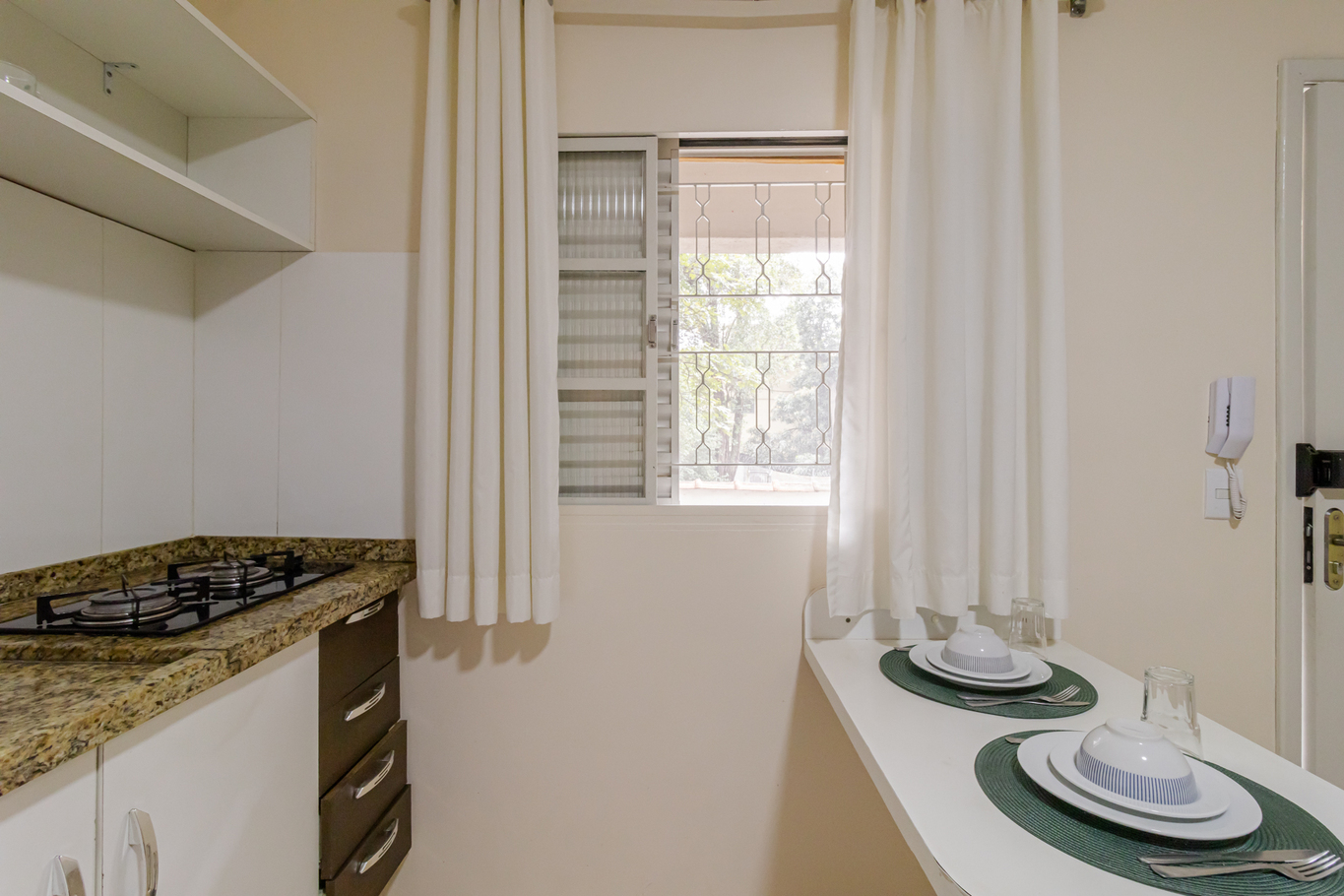 - Cozinha equipada com fogão, geladeira, microondas, pratos, copos, mesa de refeições, talheres, panelas e utensílios de cozinha(exceto óleo e sal)