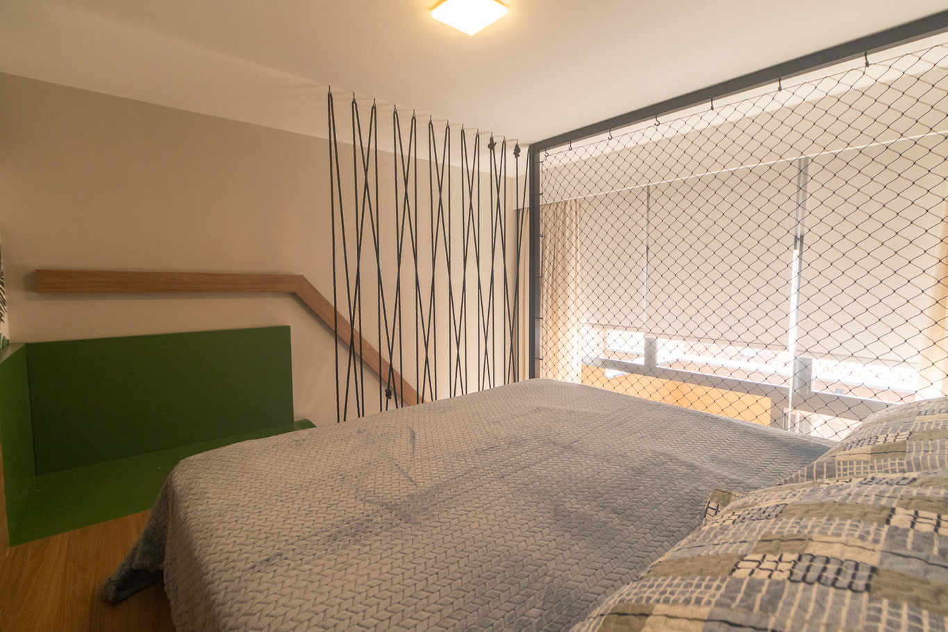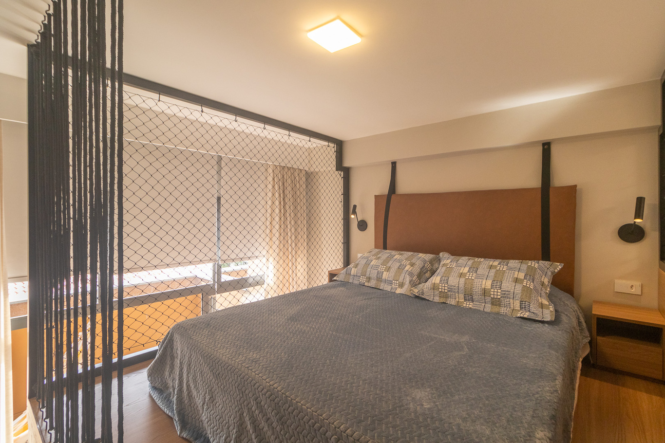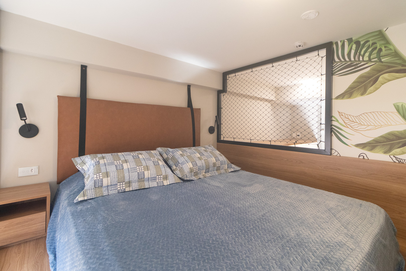 - Quarto com cama queen, armário e Smart TV