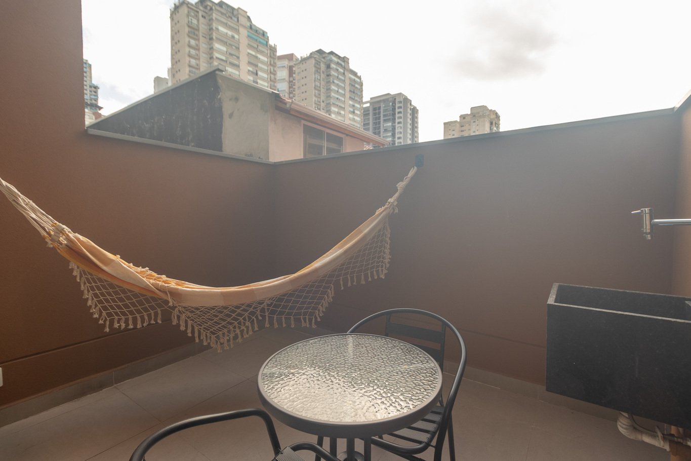 - Varanda com rede, pia, mesa e bancada de trabalho