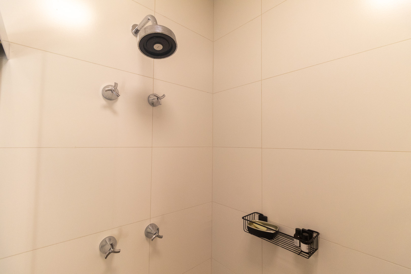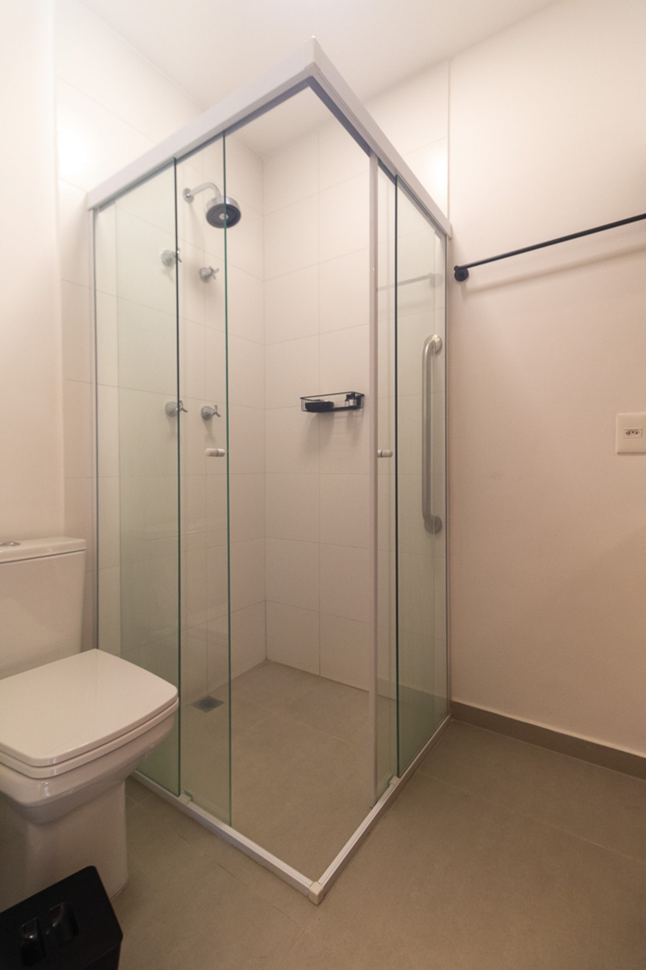 - Banheiro com box de vidro, ducha a gás e secador de cabelo