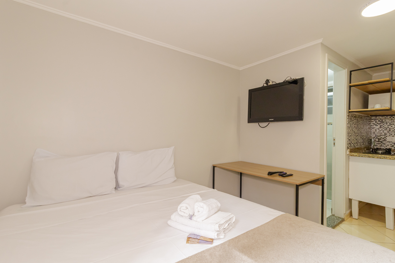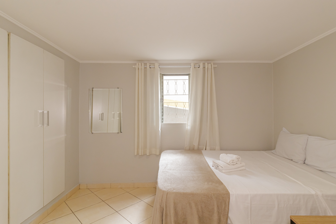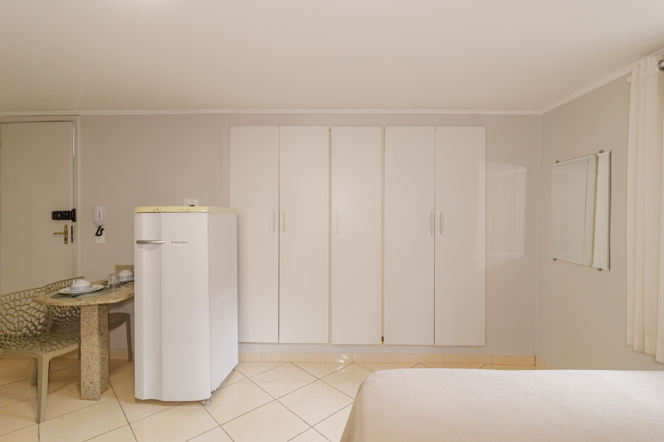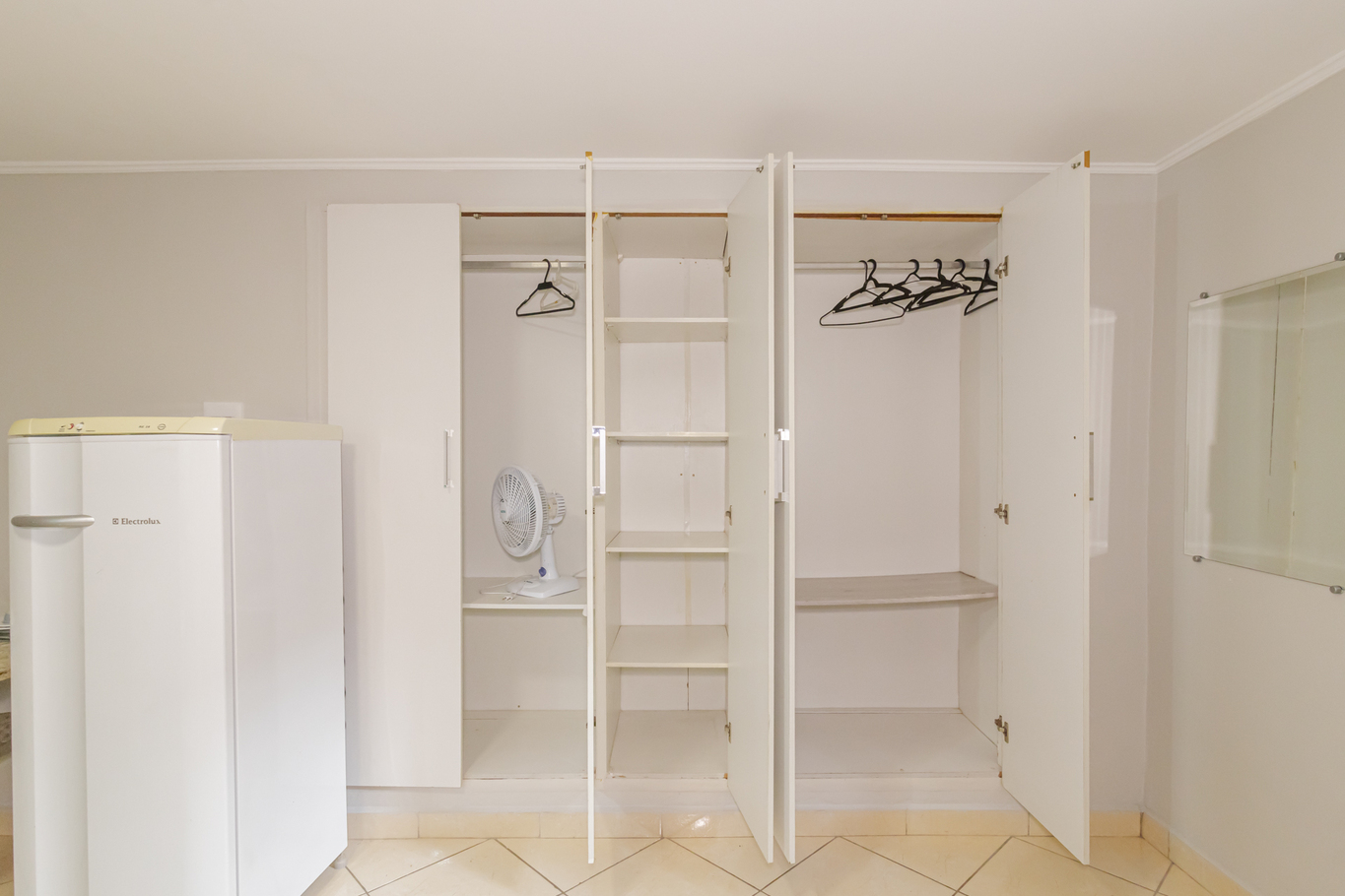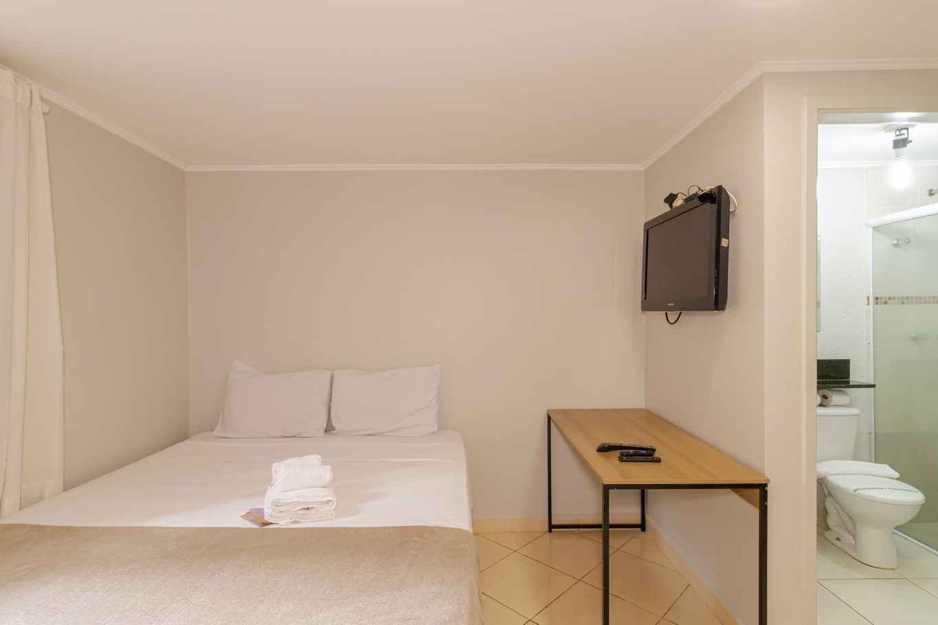- Quarto com cama de casal, armário, mesa multifuncional, protetor de colchão e ventilador de teto