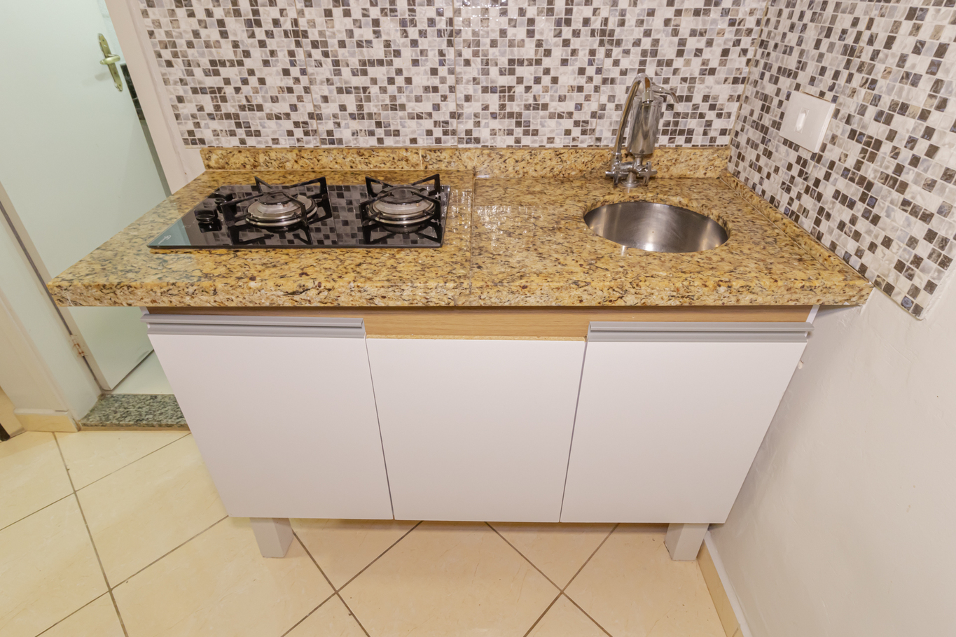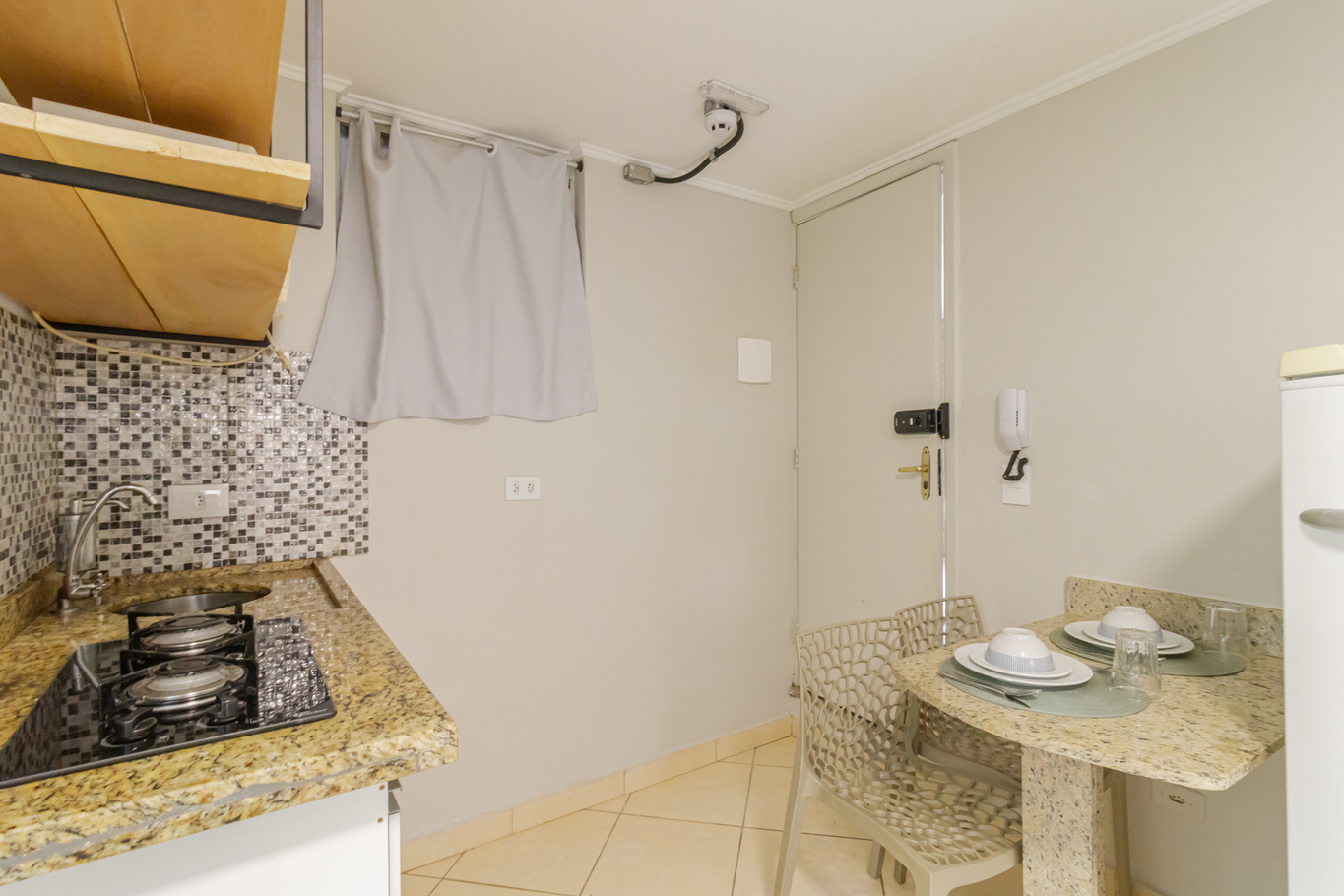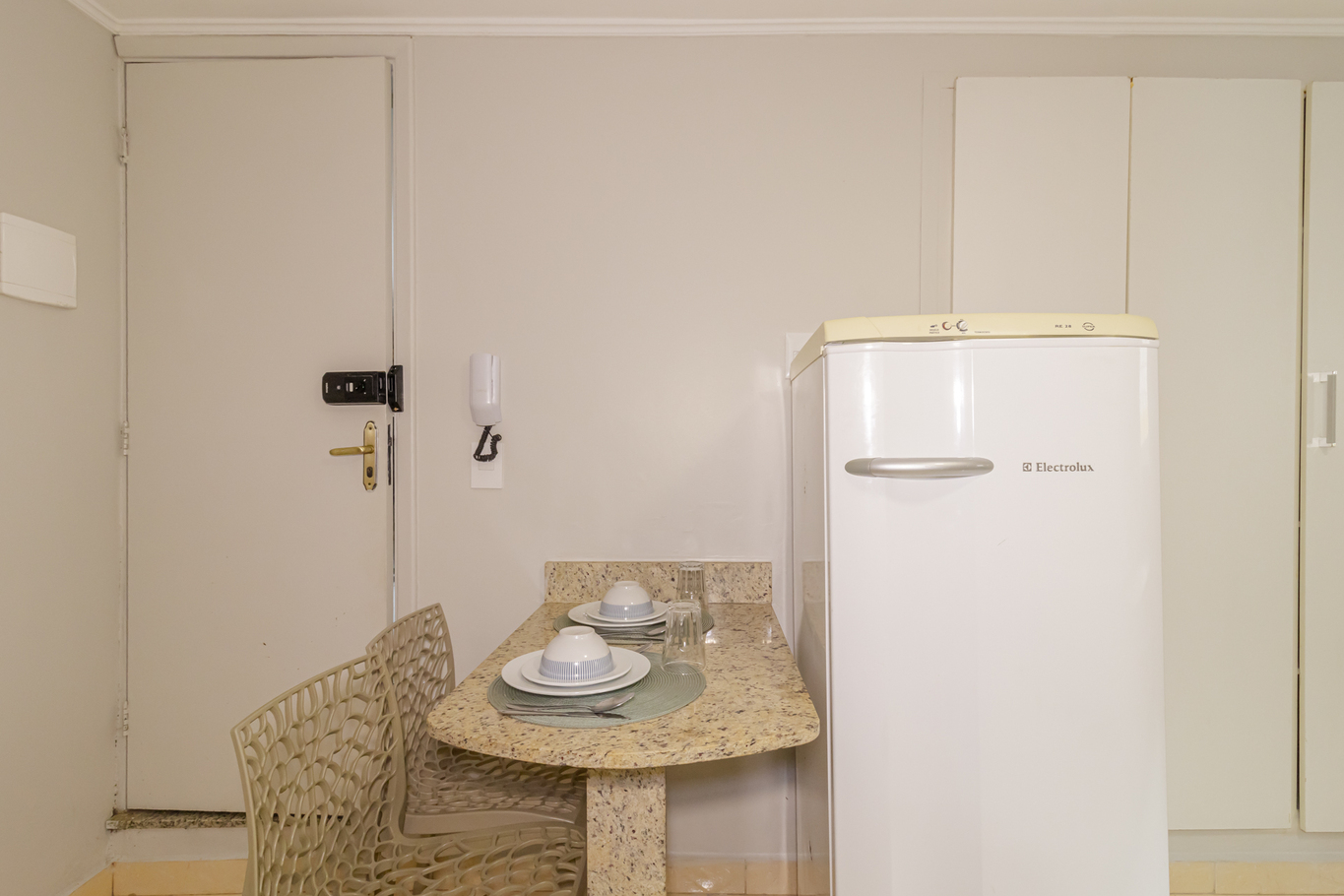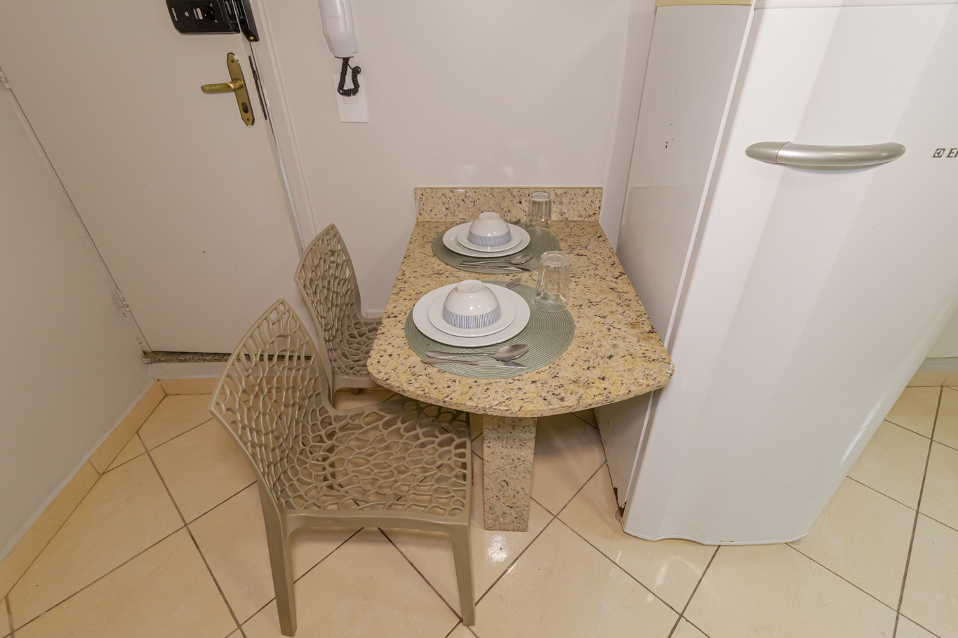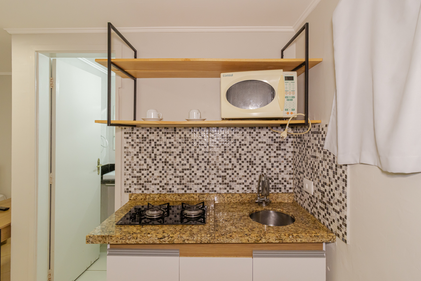 - Cozinha equipada com fogão, geladeira, microondas, pratos, copos, mesa de refeições, talheres, panelas e utensílios de cozinha(exceto óleo e sal)