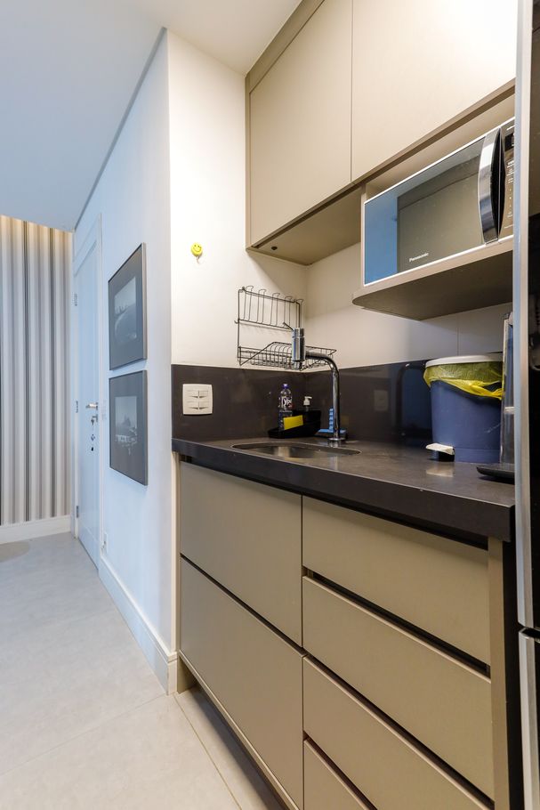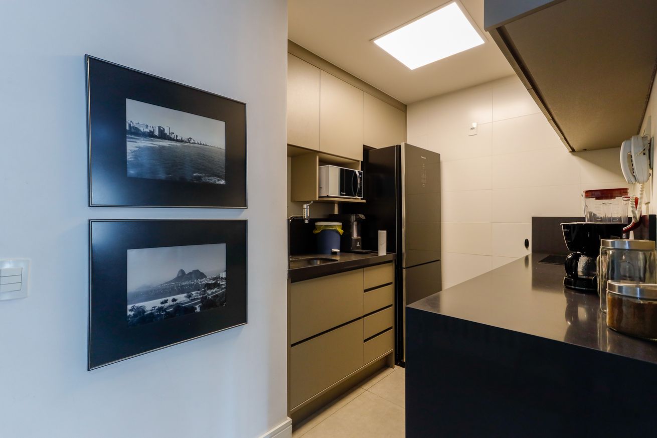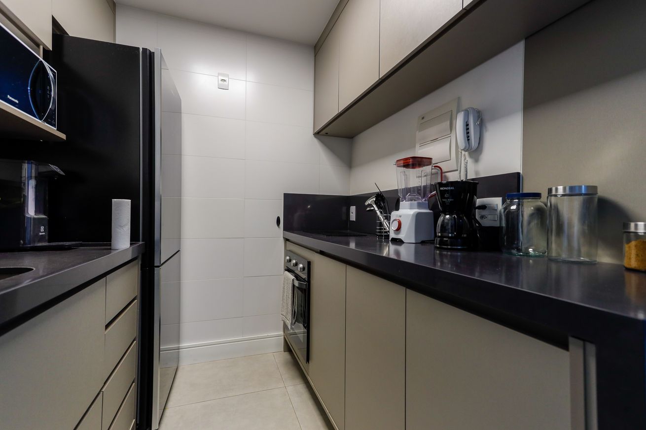 - Cozinha equipada com fogão, forno, geladeira, freezer, micro-ondas, cafeteira e liquidificador. Conta com balcão, mesa de refeições, utensílios básicos(exceto óleo e sal)