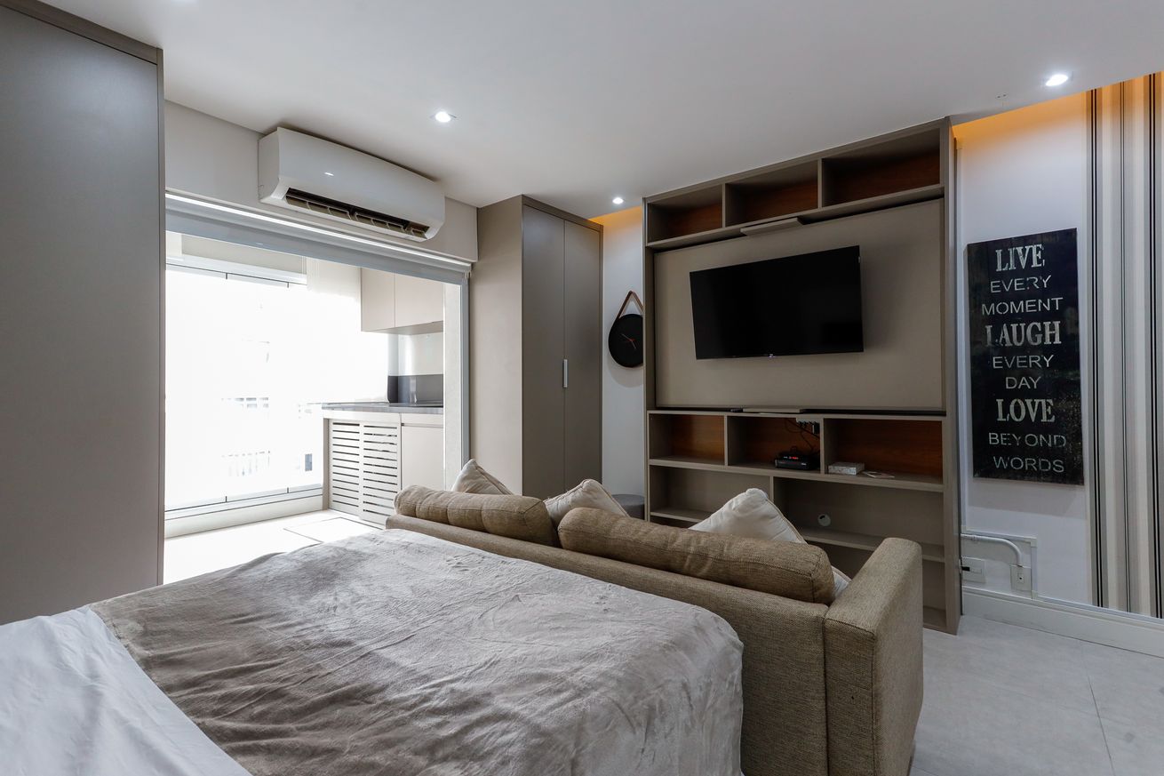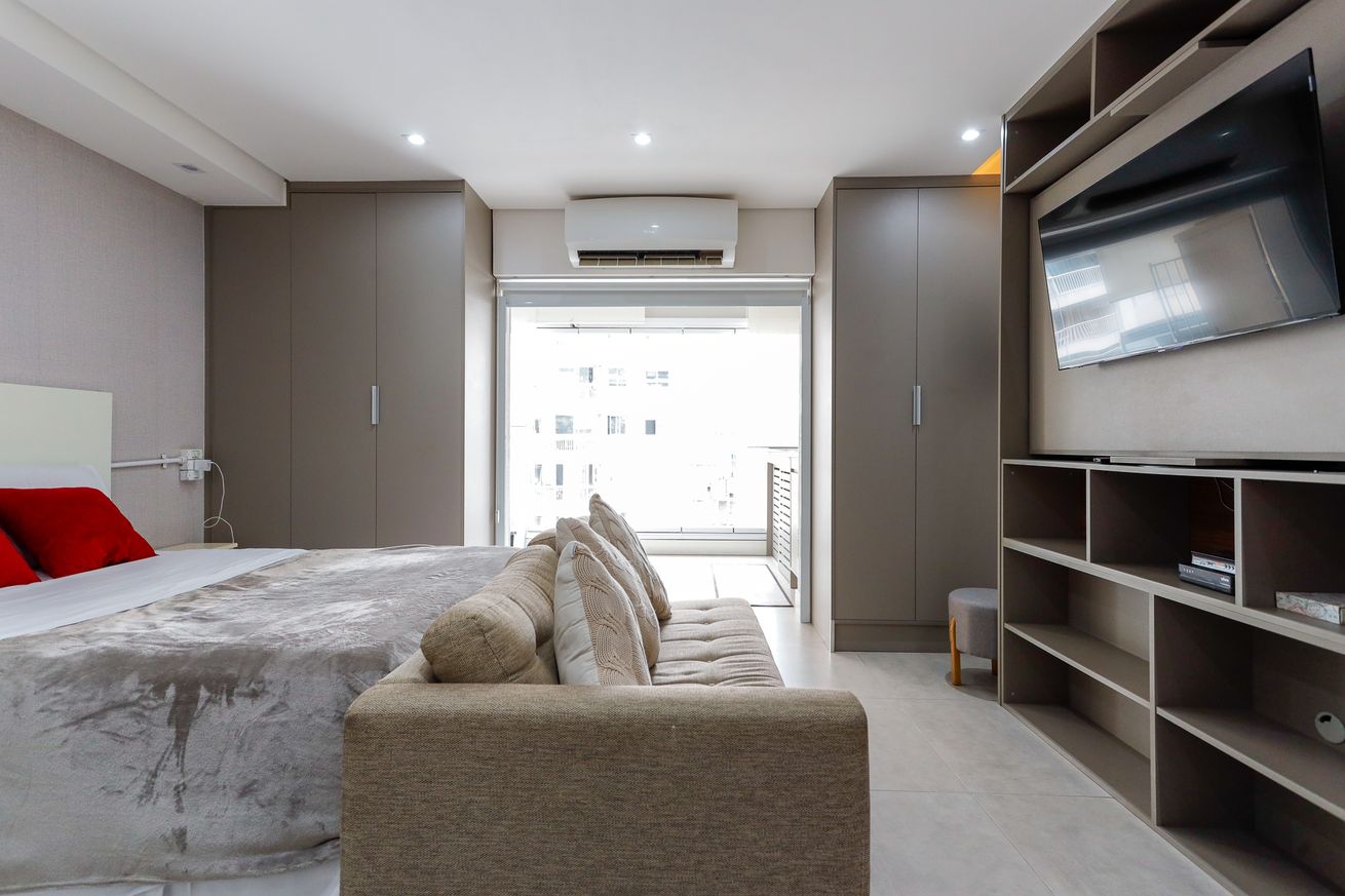 - Suíte com cama de casal, sofá-cama, ar-condicionado, armário e smart TV com TV a cabo