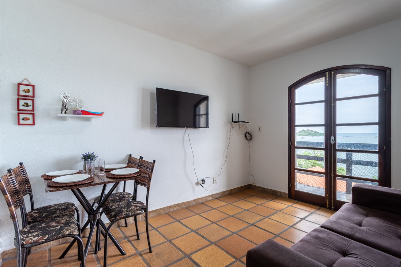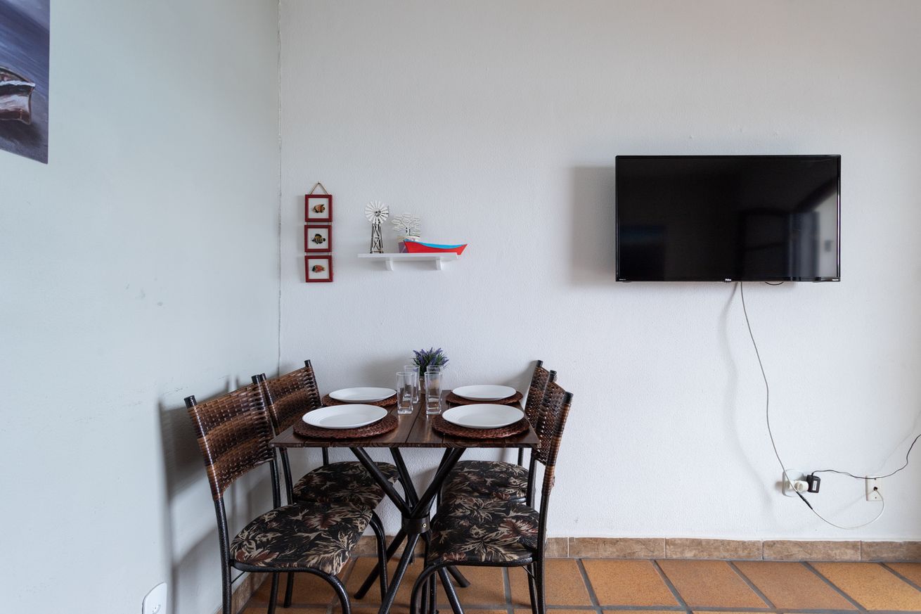 - Sala com sofá confortável, smart TV, mesa de refeições e varanda