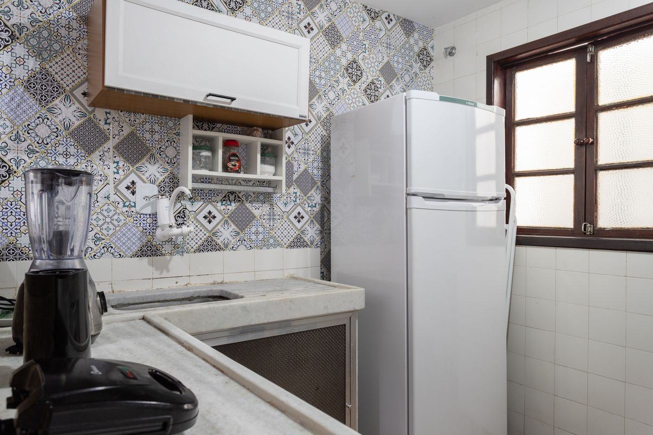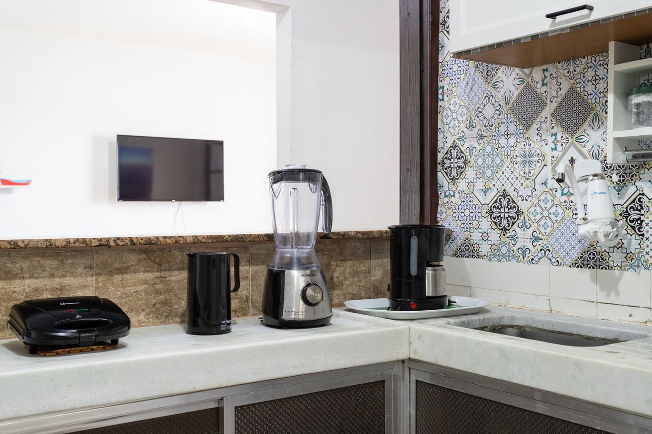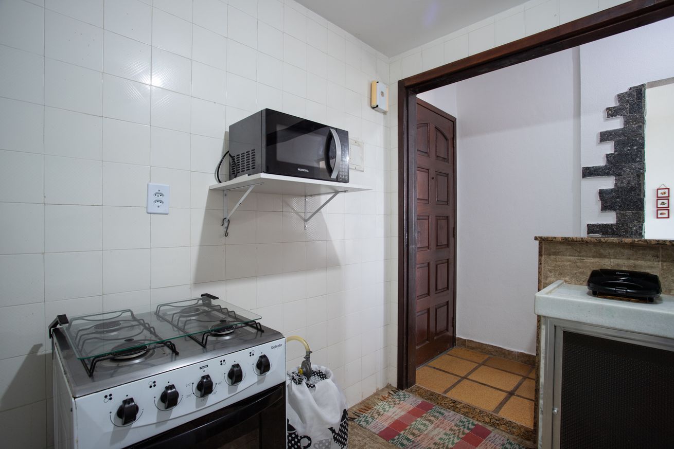 - Cozinha equipada com fogão, geladeira, microondas, cafeteira, liquidificador, torradeira, utensílios e itens diversos