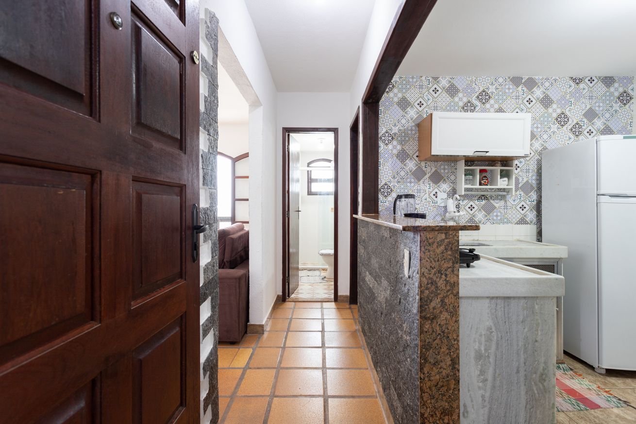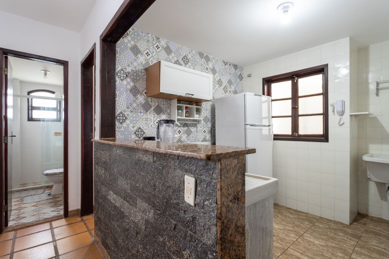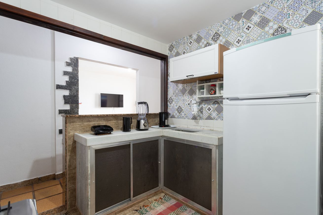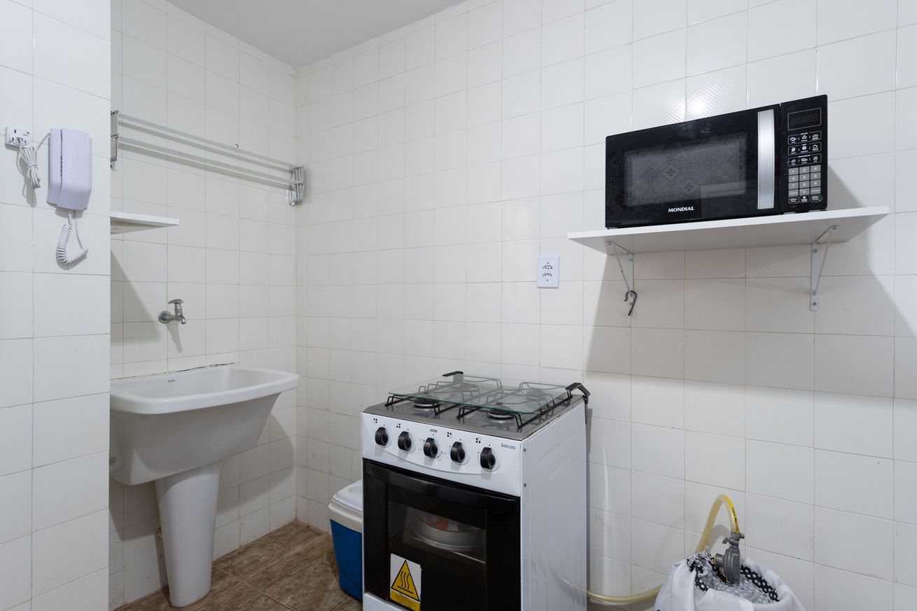- Cozinha equipada com fogão, geladeira, microondas, cafeteira, liquidificador, torradeira, utensílios e itens diversos