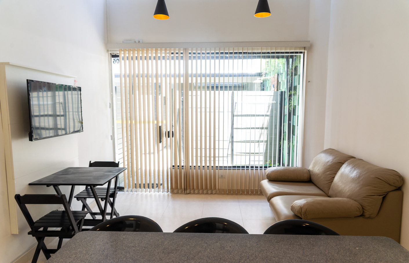 - Sala integrada com Smart TV, sofá-cama e mesa de jantar