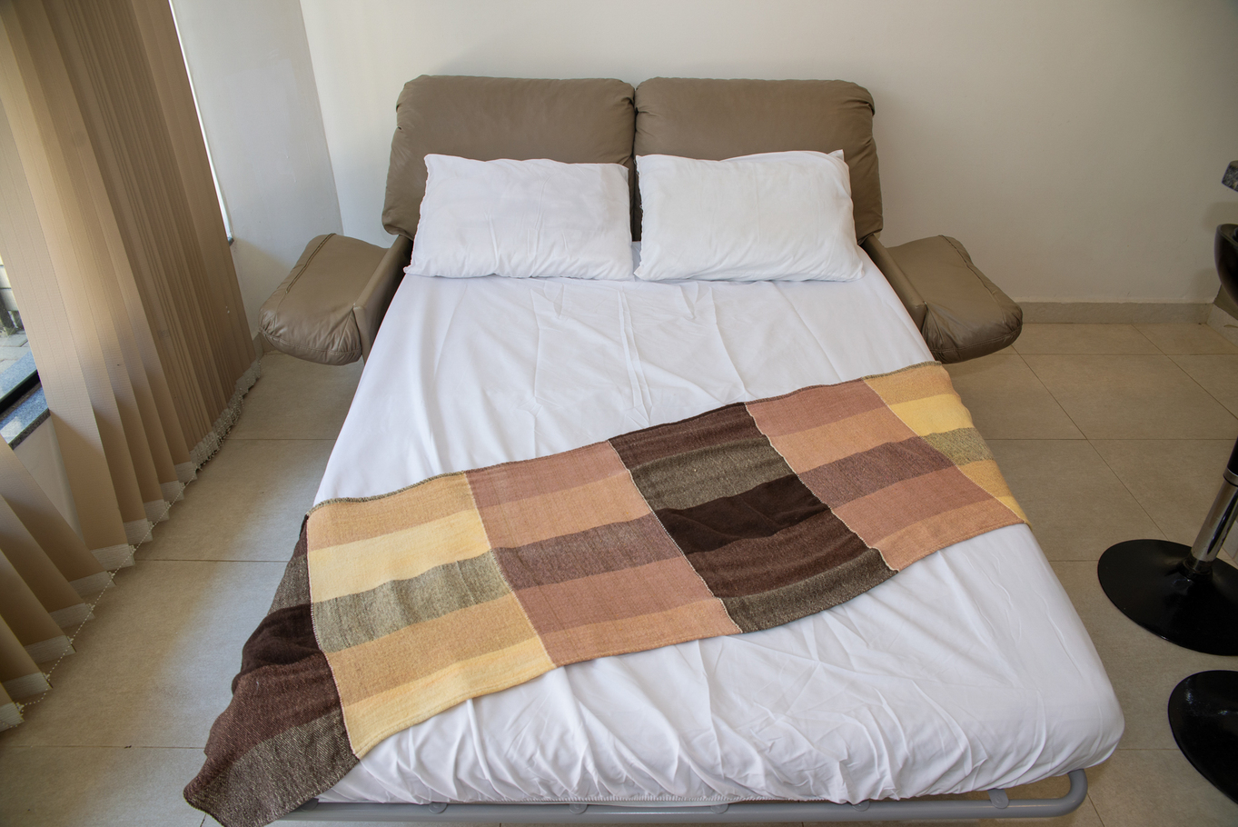 - Sala integrada com Smart TV, sofá-cama e mesa de jantar
