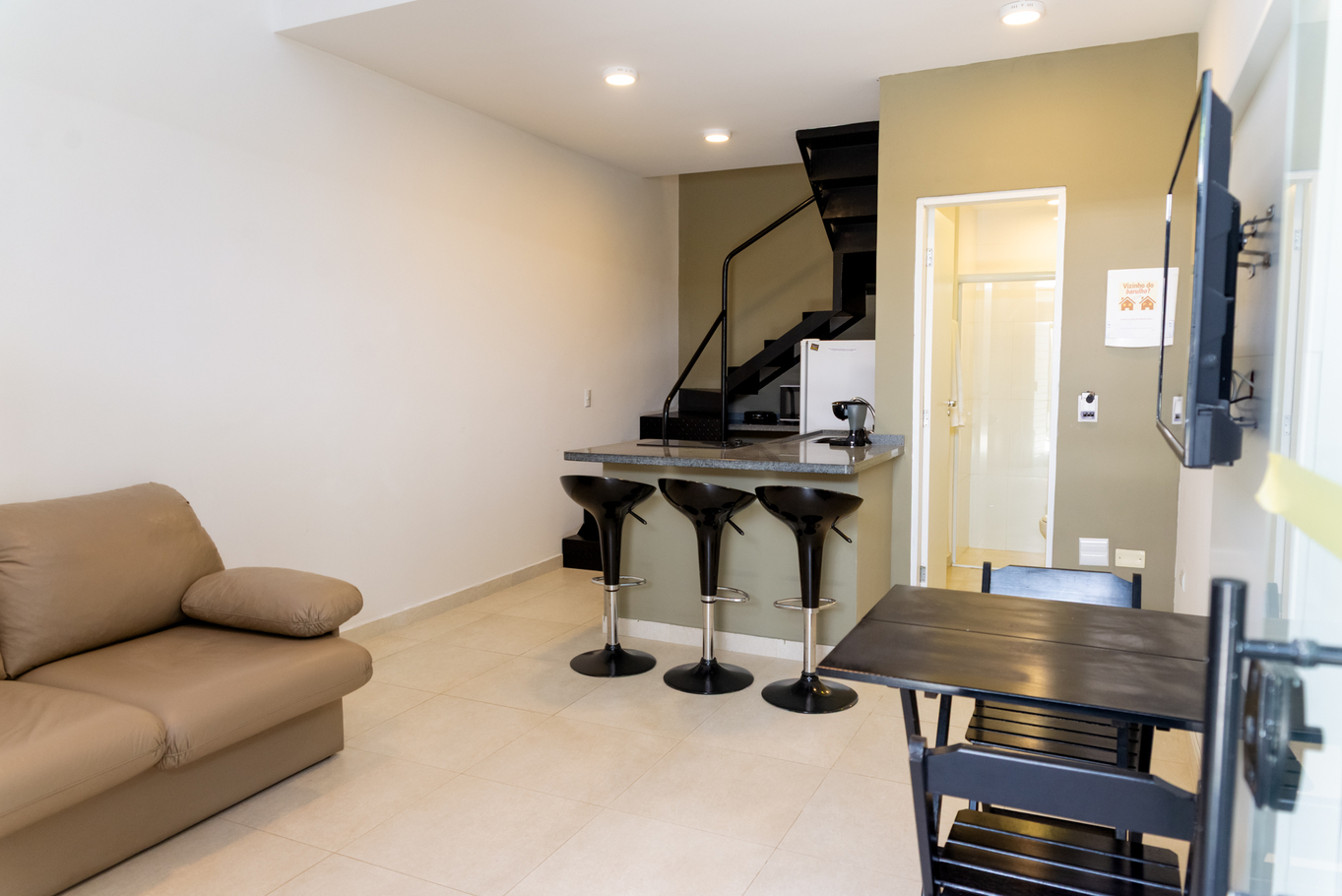 - Sala integrada com Smart TV, sofá-cama e mesa de jantar